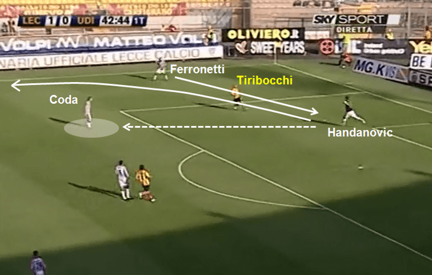 È il 2008 e sembra un’era fa. Ferronetti fa il retropassaggio al portiere solo perché spaventato dal pressing di Tiribocchi; Coda non ci pensa minimamente a orientare il corpo per non ricevere completamente di spalle; Handanovic non ha il compito di passargli la palla sul corto (anche se potrebbe) e va ciecamente al rilancio.