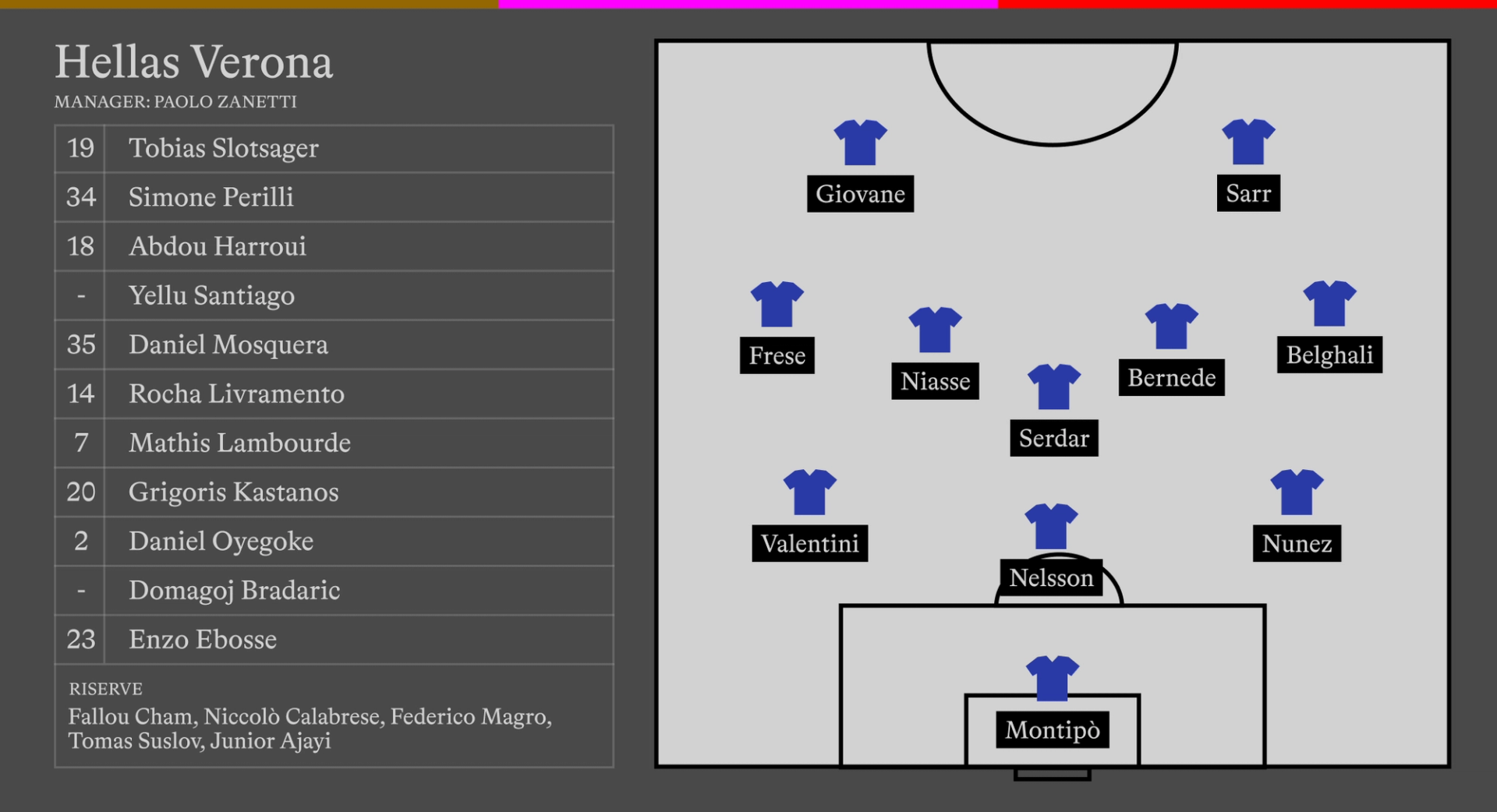 Se conoscete la Serie A sapete già in che modo il Verona ha sistemato se stesso, e cioè passando alla difesa a 3. Alla linea difensiva si è aggiunto Daniele Ghilardi sul centro-sinistra, a fianco dell’aggressivo Coppola e del più esperto Dawidowicz. Pian piano il Verona ha cominciato ad assumere senso, rispetto al 4-2-3-1 precedente. I due esterni, Lazovic e Tchatchoua, tenevano un atteggiamento asimmetrico, col serbo più in aiuto della fase offensiva e il francese più prudente. A centrocampo, con la cessione di Belahyane a gennaio, si è arrivati al trio Serdar, Duda, Suslov: giocatori capaci di ricucire tanto campo in avanti, fondamentale per una squadra che si è difesa molto bassa vicina alla porta di Montipò, così come i due attaccanti: Sarr e Tengstedt, o Sarr e Mosquera, quando il danese si è infortunato.
