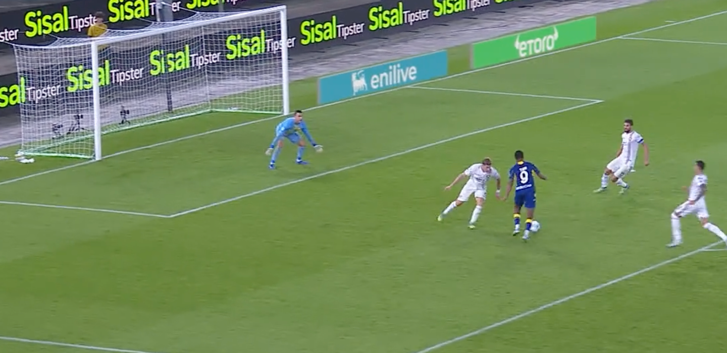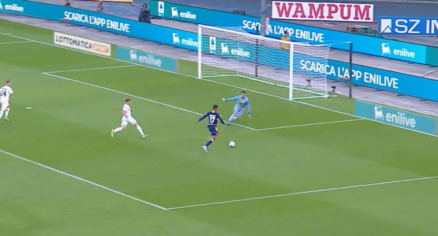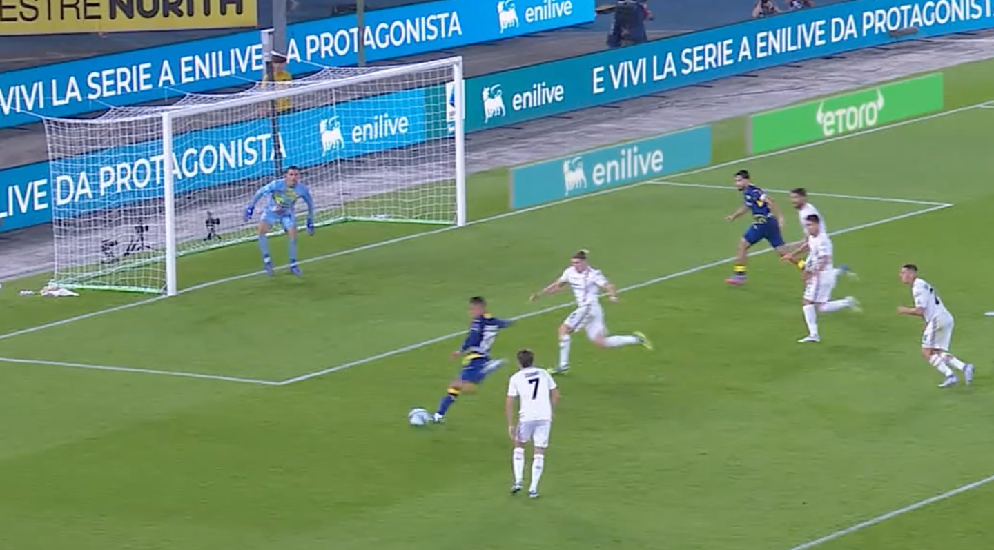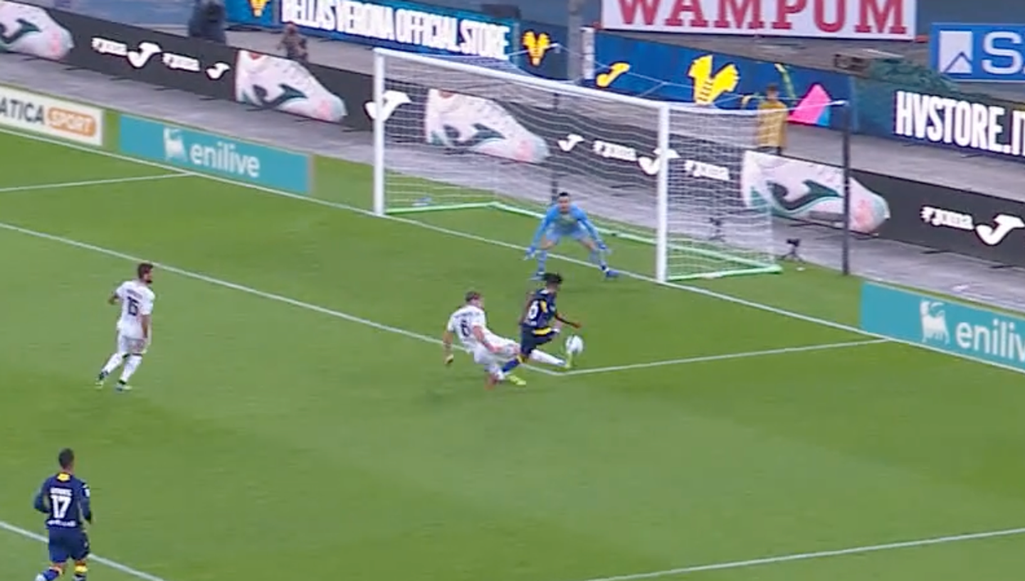 L’Hellas sviluppa benissimo l’azione in ampiezza per portare Bradaric al cross dalla trequarti. Giovane ha la lucidità di allungare la traiettoria. L’attaccante nigeriano ripropone in mezzo per Belghali che ha seguito l’azione. Il cross è preciso, la difesa è tagliata fuori, sembra tutto apparecchiato per il tap-in, ma. C’è sempre un ma in questo campionato del Verona.