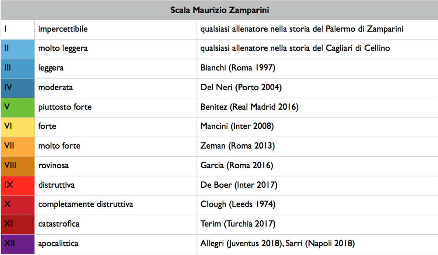 Per rendere onore a una tradizione che ha solcato l’immaginario del nostro campionato più dell’inno scritto da Allevi (al primo commentatore che saprà ricordarne il titolo senza googlare “inno”+”serie a” andrà in regalo una finta lettera di esonero da allenatore del Palermo) ho scelto di classificare l’impatto potenziale (in crescendo) del sollevamento dai propri incarichi di 5 allenatori della nostra massima serie. L'immagine qui sotto riporta un esempio di gravità calcolato seguendo la cosiddetta "Scala Zamparini".