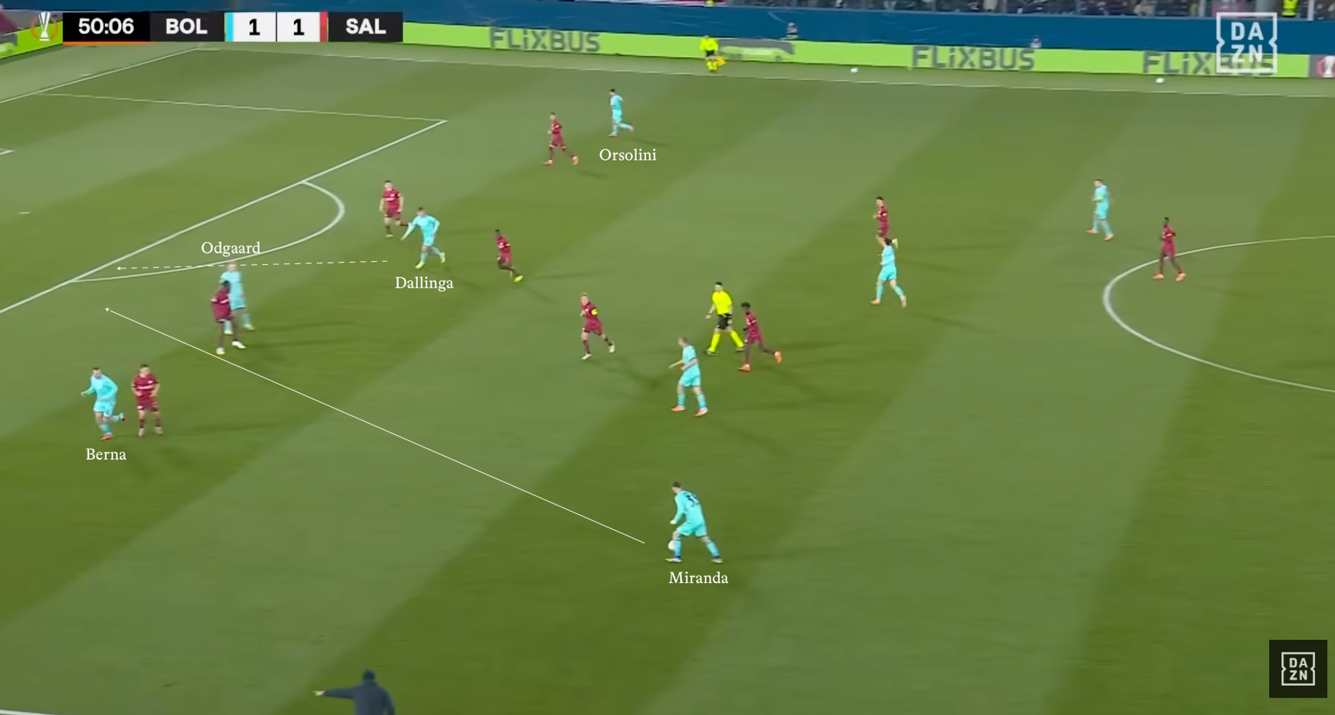 Ma il Bologna gioca così bene, oggi, che è difficile trovare un solo tipo di sviluppo prevalente nella squadra. I rossoblù brillano per palle conquistate in avanti, sviluppo centrale e sulle catene laterali. Resta una squadra per lo più verticale, che risale il campo con una certa urgenza, ma ultimamente sembra anche più ordinata quando attacca la metà campo avversaria. Miranda, a sinistra, sta prendendo un’influenza sempre più grande nello sviluppo del gioco. È il segreto di pulcinella, il fatto che i terzini hanno più spazio di altri giocatori, e Miranda è uno di quelli con la qualità per sfruttarlo, questo spazio. Nell’immagine sotto, appena prima del gol di Dallinga, Miranda serve un assist delizioso, ma il Bologna è scaglionato bene nei corridoi. Odgaard attira su di sé la linea e attenzione, e un attaccante non bravissimo spalle alla porta com Dallinga può approfittarne per attaccare la profondità alle sue spalle.