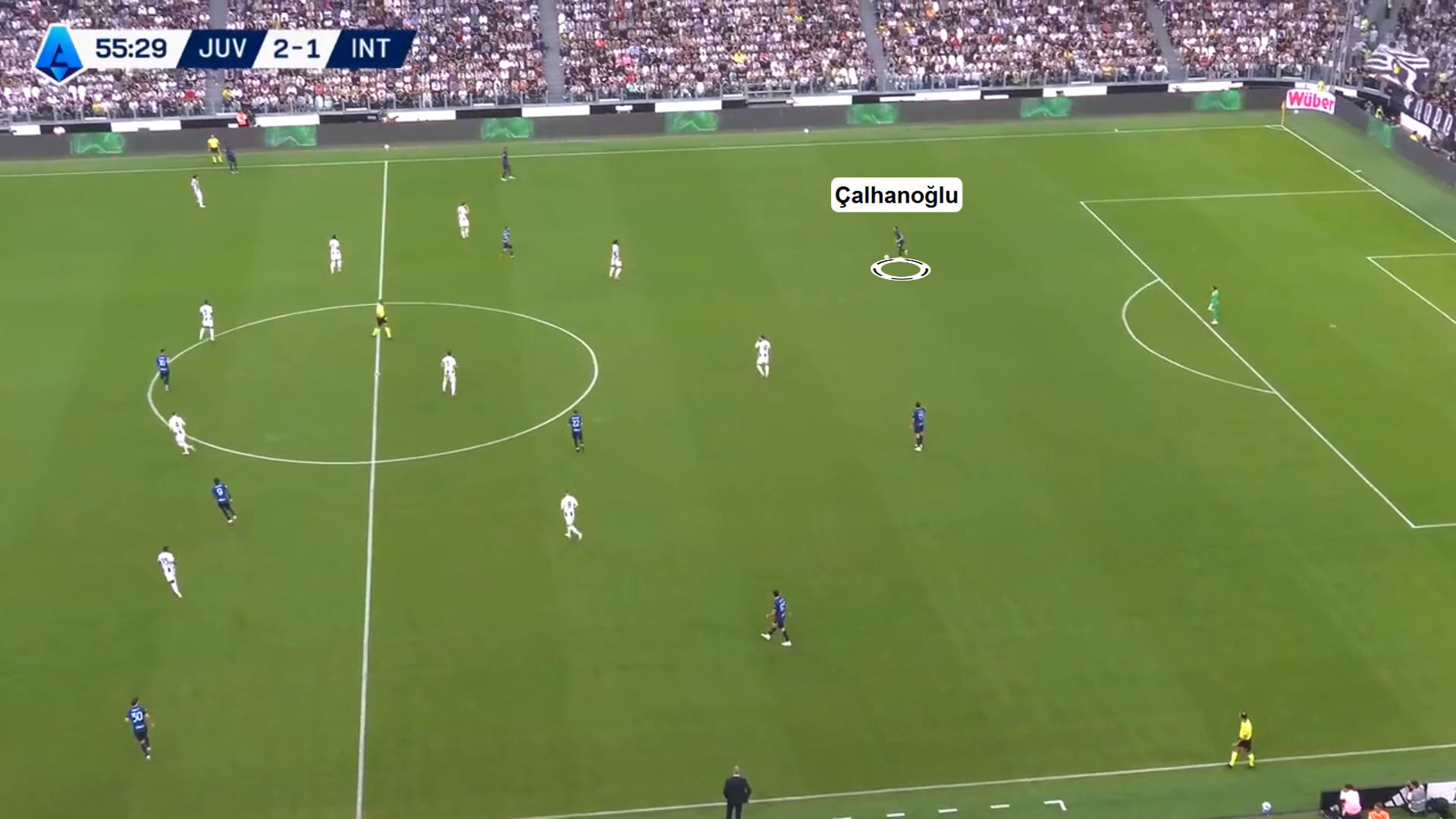 Il turco nella prima linea costruttiva dell’Inter nel secondo tempo della gara contro la Juventus.