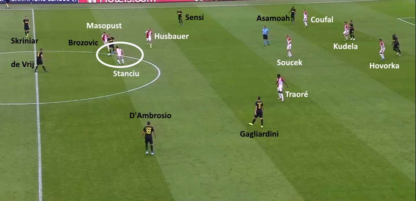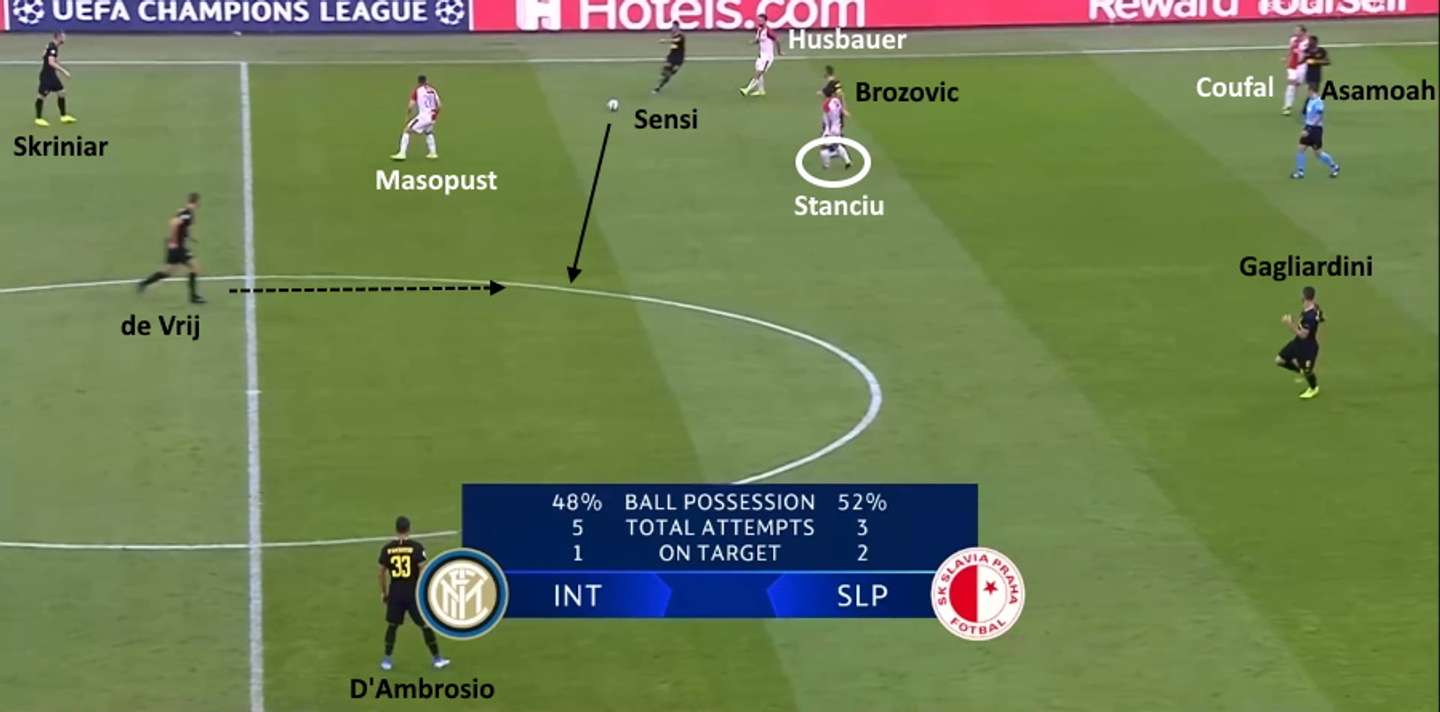 C'è stata un'occasione in cui una palla persa da Brozovic stava per mandare in porta lo Slavia. L’Inter stava impostando l’azione nella metà campo avversaria dopo aver battuto un calcio di punizione, ma non riesce ad avanzare a sinistra. Sensi allora torna al centro da de Vrij, che vede lo spazio lasciato libero da Stanciu, impegnato dalla marcatura di Brozovic, e va a ricevere il passaggio.