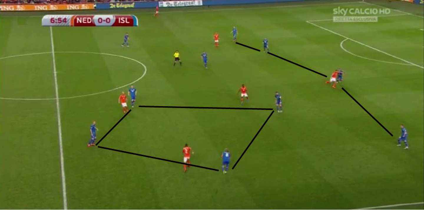 Il pressing, comunque, è tutt’altro che ossessivo. Se la squadra avversaria torna indietro o cambia gioco, i giocatori recuperano le loro posizioni. La priorità è non perdere compattezza: l’Islanda recupera palla soprattutto forzando l’errore avversario, specie costringendo al lancio lungo, forte della superiorità sulle palle alte. Nell’undici base solo due giocatori, il capitano Aron Gunnarsson e il terzino sinistro Ari Skúlason, sono sotto il metro e 80.