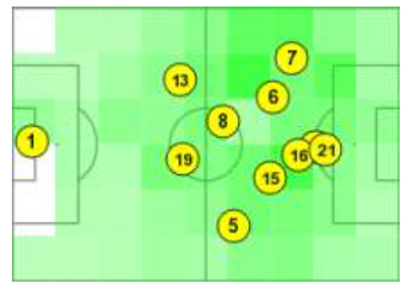 La strategia dell’Italia non ha funzionato alla perfezione, sia per la buona organizzazione difensiva della Finlandia che per demeriti propri. Gli uomini di Kanerva si sono schierati con uno strettissimo e inedito 5-4-1 in cui le fondamentali e ricercate ricezioni negli half-space sono state rese difficoltose sia dalla posizione particolarmente interna occupata in fase di non possesso dai due esterni di centrocampo – Lod e Hamalainen - che dalle aggressive uscite dei due difensori laterali del terzetto arretrato. Gli scandinavi sono riusciti a tenere la squadra molto corta (28.3 m) e a proteggere bene il centro del campo. Inoltre, nonostante il possesso palla sia stato a favore dell’Italia (58.2%), la Finlandia, oltre che corta è riuscita a tenere la linea difensiva anche piuttosto in alto (il suo baricentro si è posizionato a una altezza media di 51 metri, solo 0.6 metri in meno di quello dell’Italia), riducendo gli spazi utili nella fondamentale zona di rifinitura.