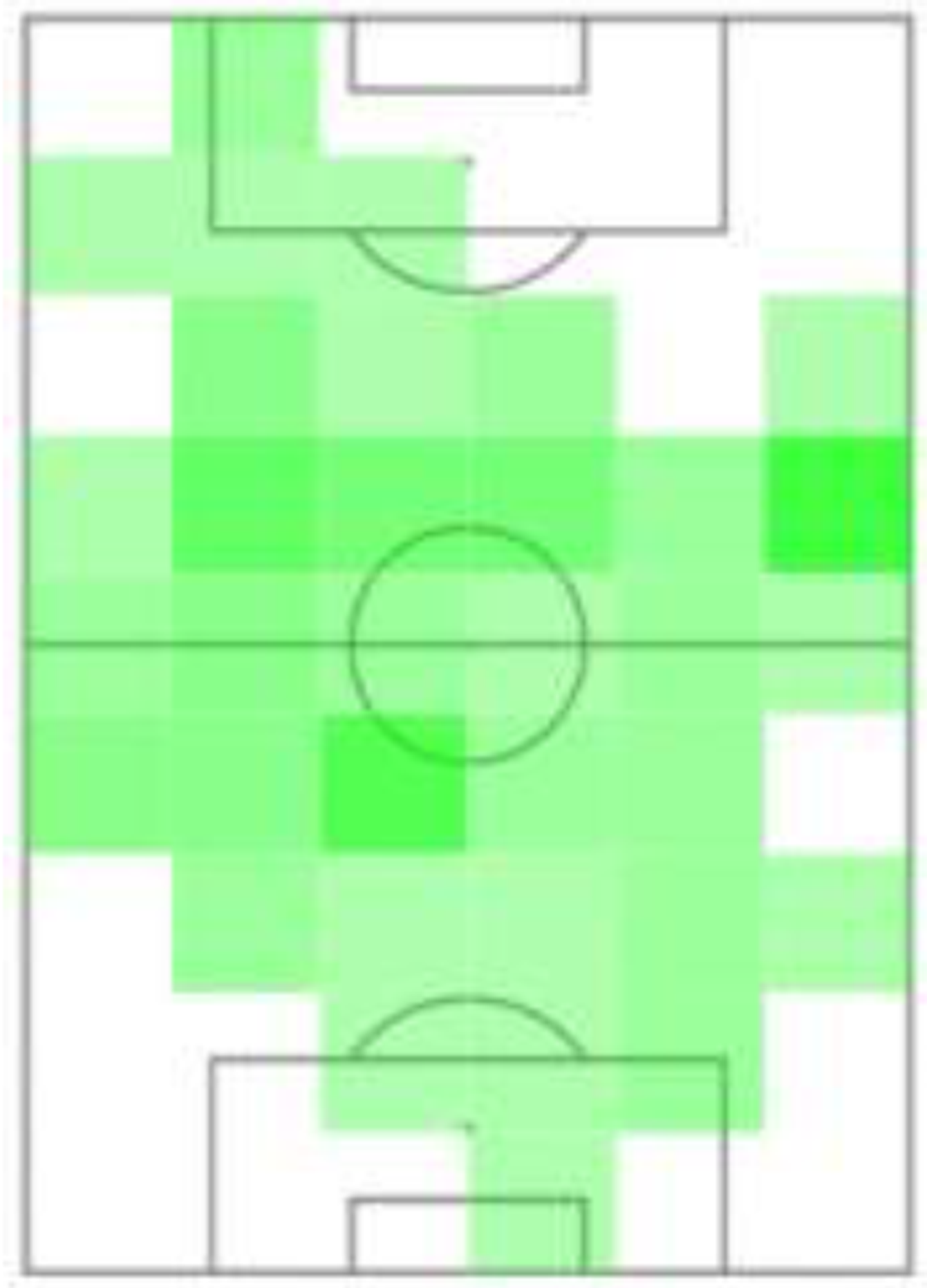 La partita a tutto campo di Barella nella mappa dei suoi interventi (a una maggiore intensità di colore corrisponde una maggiore frequenza di giocate).