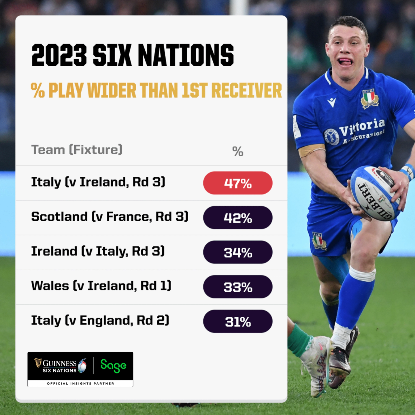 L’Italrugby, sempre tenendo come riferimento la stagione 2022 e le prime tre partite del Sei Nazioni 2023, ha una media di 89 attacchi palla in mano a partita: la più bassa, secondo i dati Opta, fra le nazioni top tier. Nonostante un numero inferiore di opportunità offensive, l’Italia è però in testa alle rilevazioni statistiche se si confronta questo dato con quello degli avversari battuti, 1 ogni 4.5 attacchi (dietro soltanto a Giappone e Scozia), e del line break, in cui l’Italia registra la migliore performance fra le squadre di primo livello, 1 ogni 18,5.