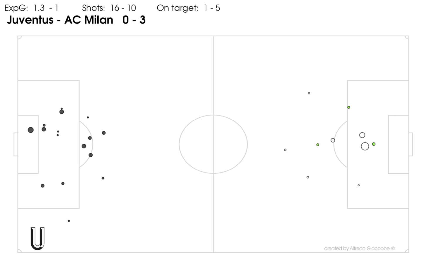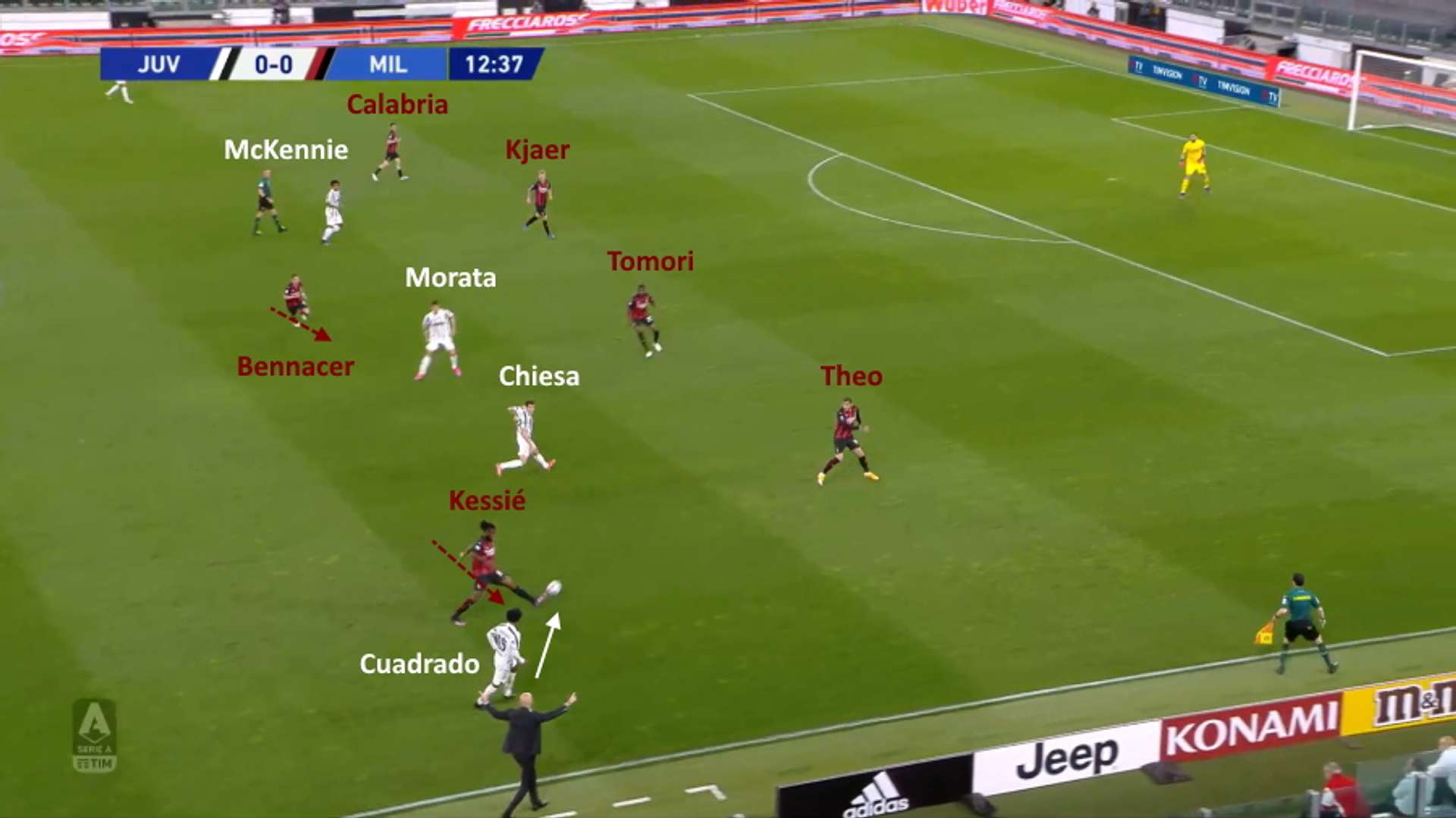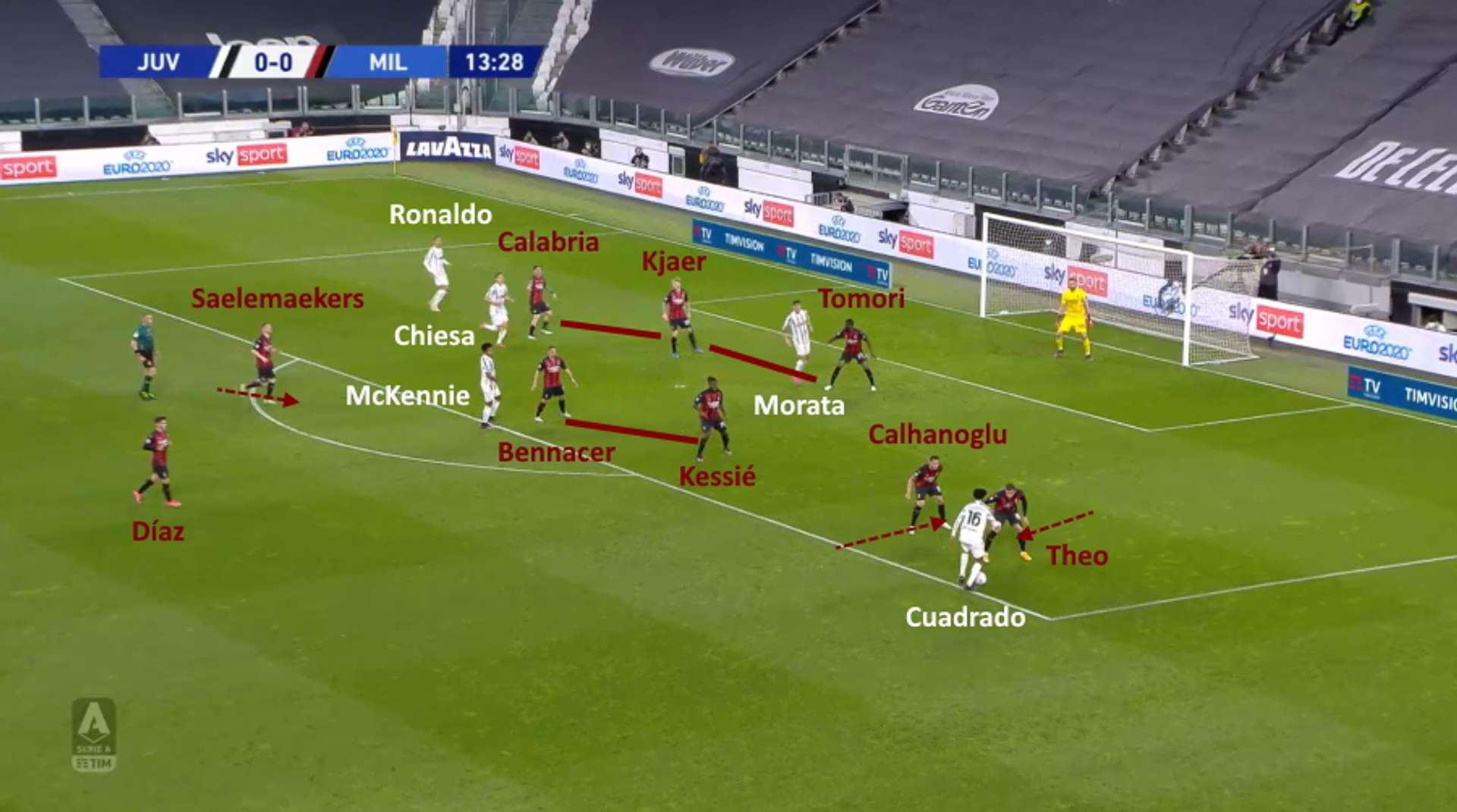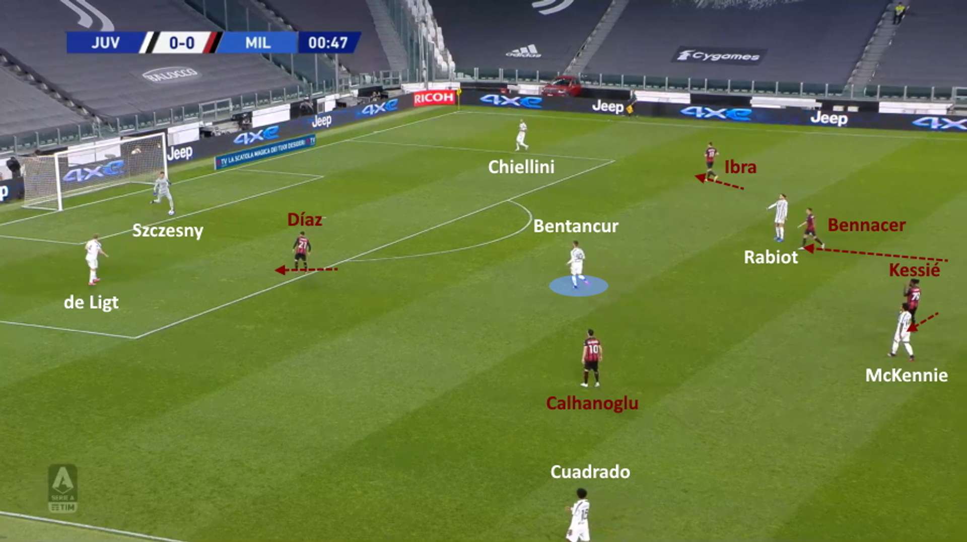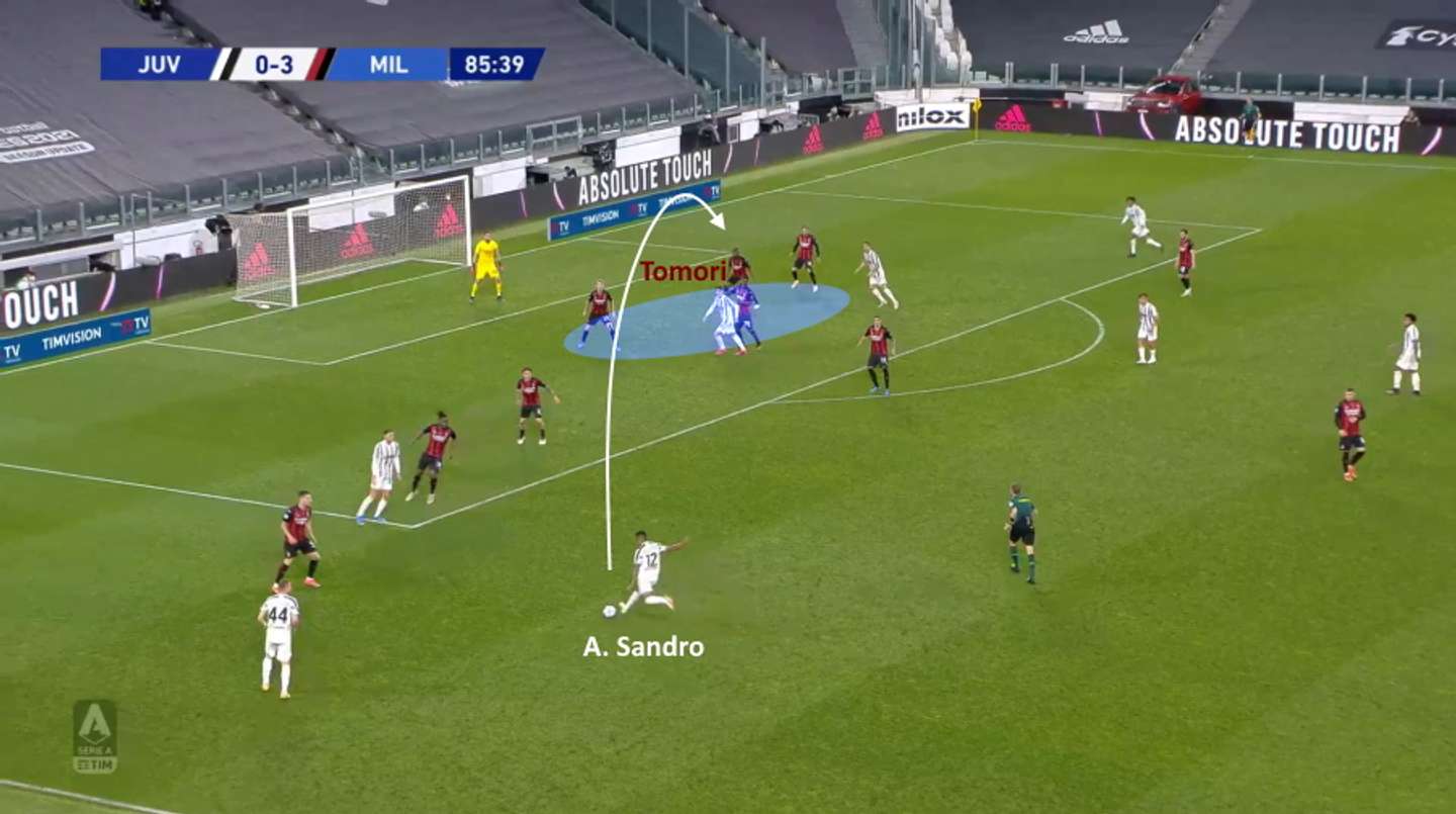L’unico tiro in porta della Juventus è arrivato con un altro inserimento sul lato corto, di Bentancur, rimasto solo perché Bennacer non ha accorciato in tempo dopo che i suoi compagni sulla sinistra (Kessié, Hernández e Tomori) erano stati portati fuori posizione dallo sviluppo della manovra sulla fascia.