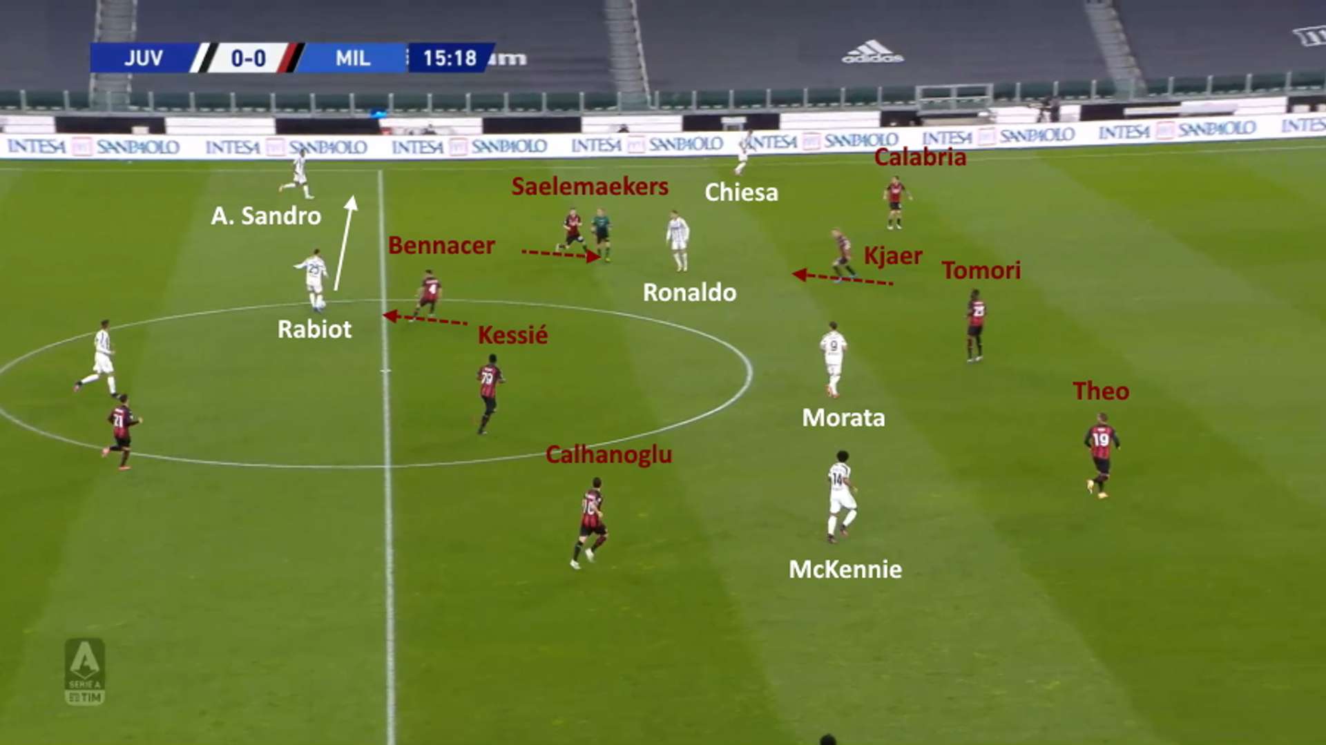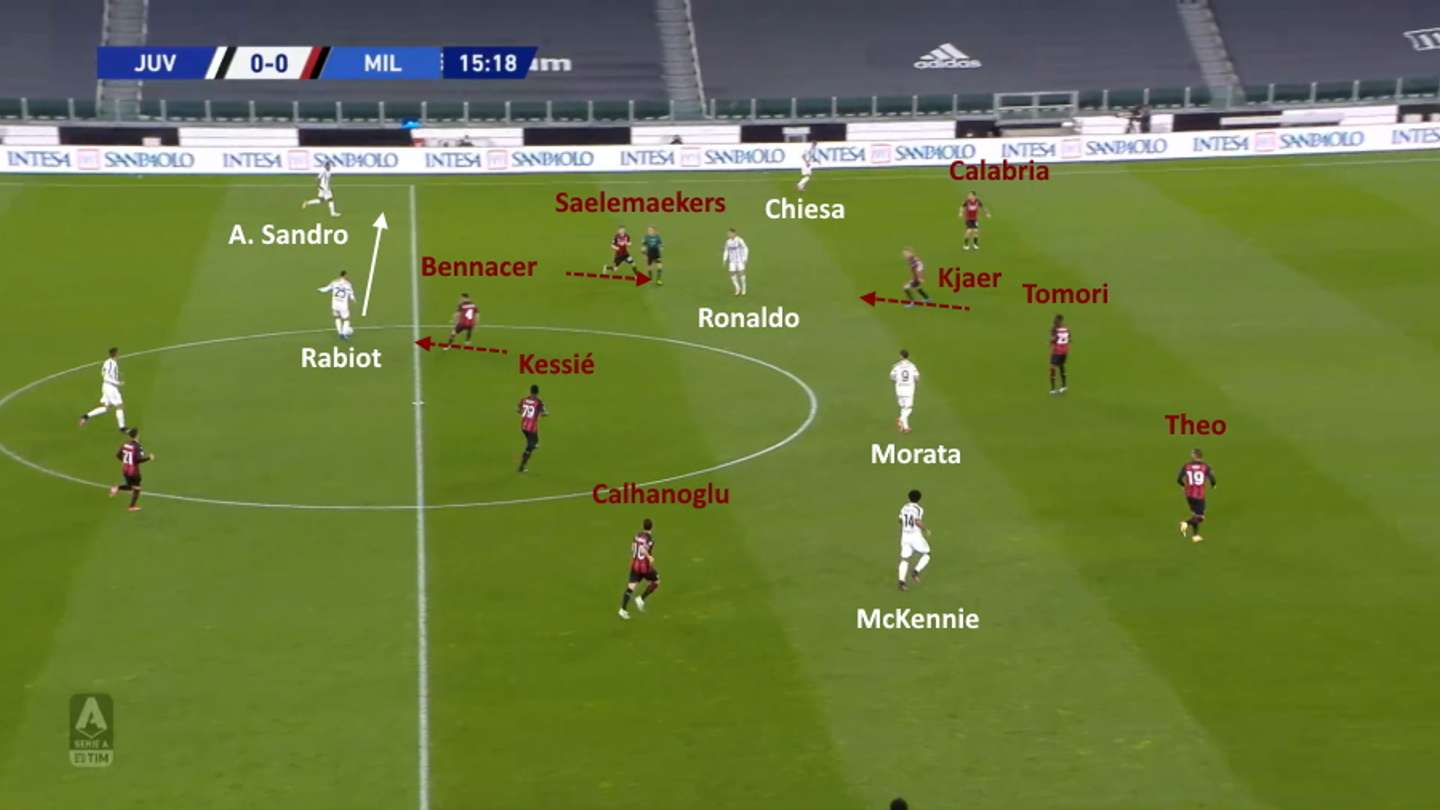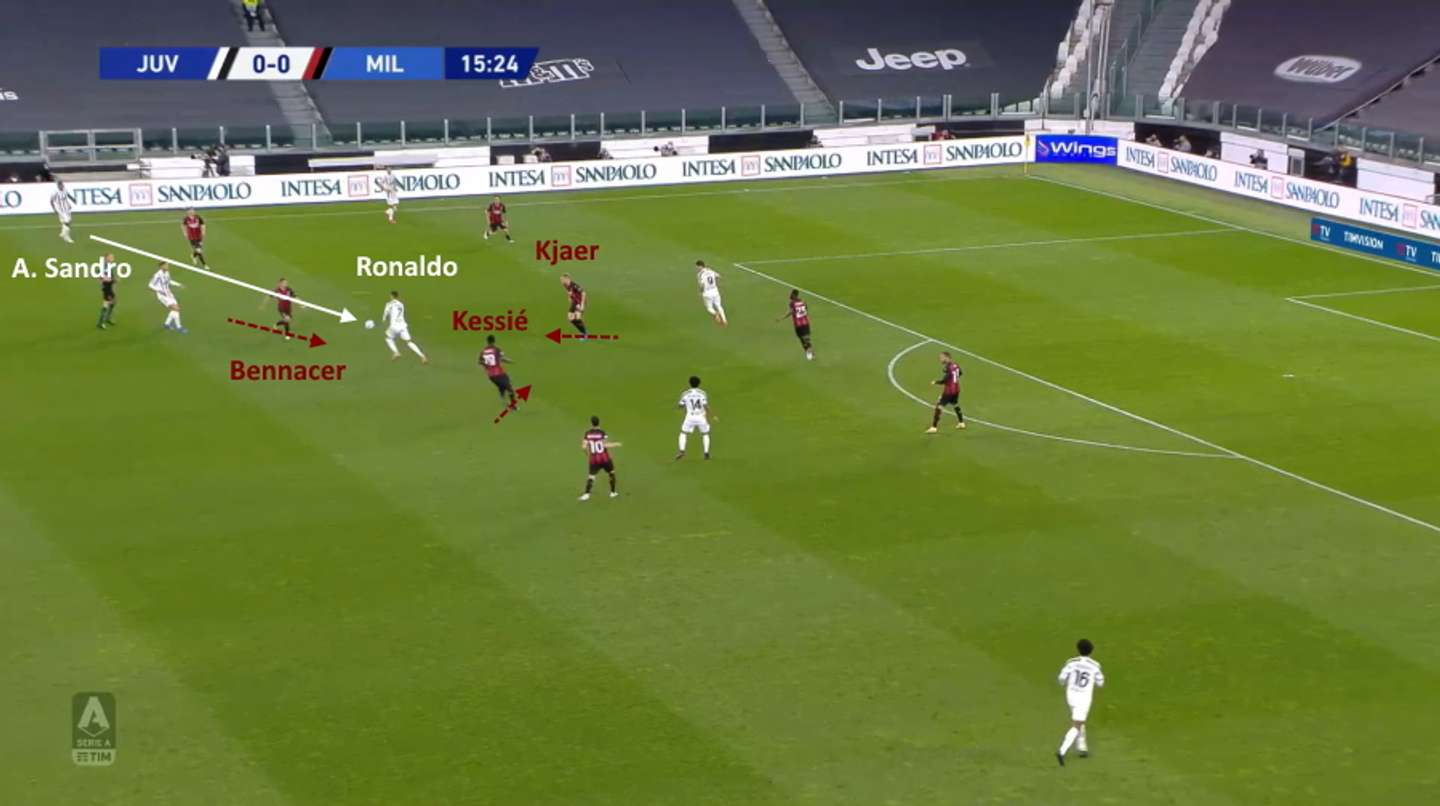 La scelta più facile per Rabiot è in orizzontale su Alex Sandro, ma ancora una volta i mediani del Milan rientrano velocemente in posizione e interrompono la manovra bianconera sul passaggio in diagonale verso il centro. In questo caso l’intervento decisivo per recuperare la palla è di Bennacer su Ronaldo.