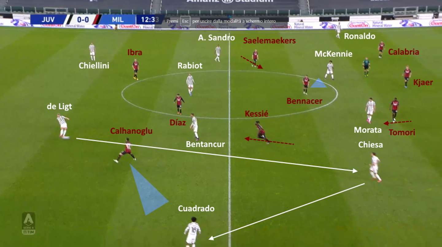 Qui sotto per esempio Chiesa resta libero perché Kessié si sta alzando su Bentancur, Calhanoglu è più avanzato e copre il passaggio verso Cuadrado, mentre Theo Hernández preferisce restare in posizione, dando quindi modo ai bianconeri di costruire un triangolo appoggiandosi a Chiesa.
