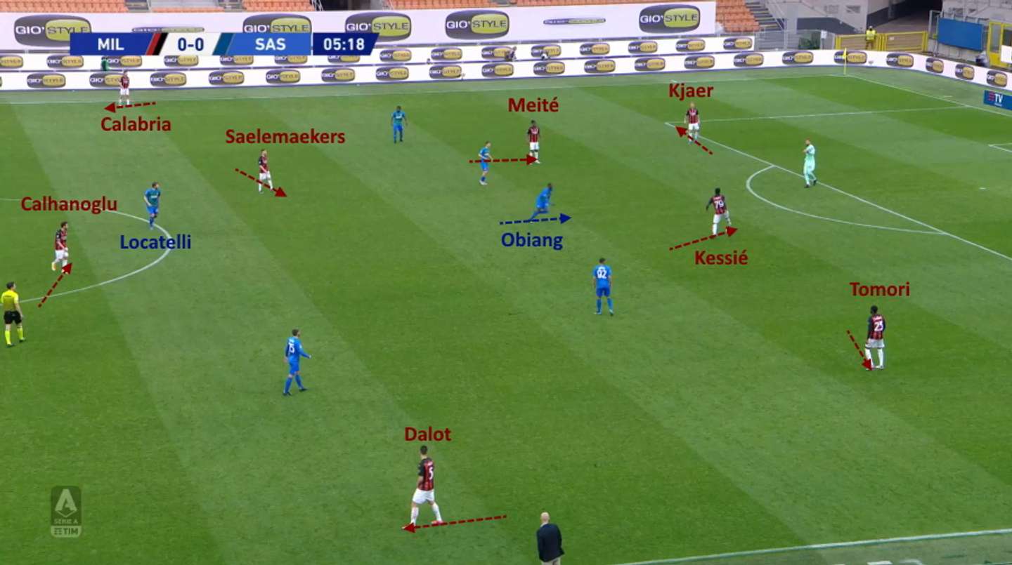Qui Obiang esce a pressare Kessié e Locatelli resta solo tra Saelemaekers e Calhanoglu.