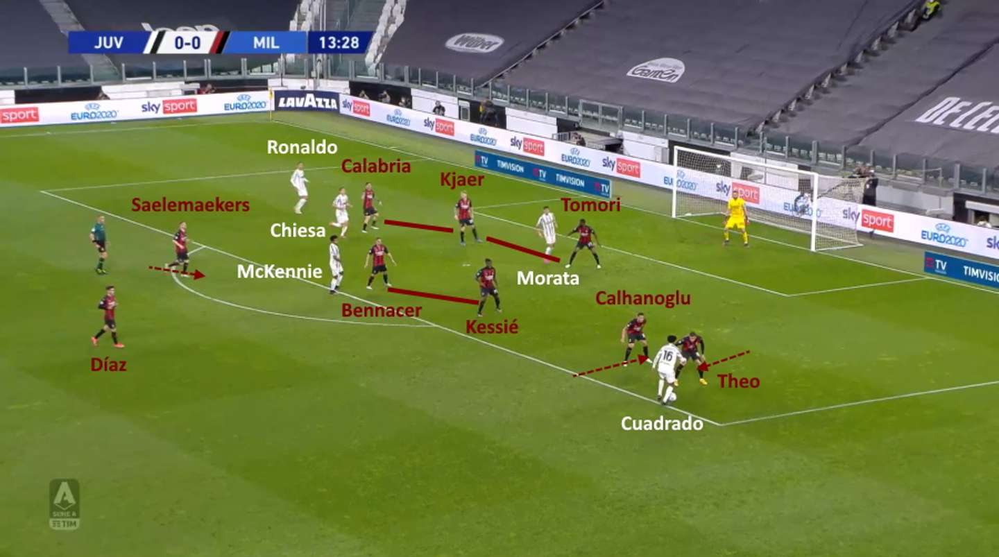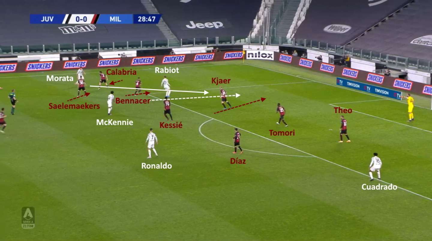 Pressando meglio e accompagnando la manovra della Juventus sulle fasce, il Milan ha quindi evitato le situazioni che avevano causato la sconfitta nella gara di andata. I difensori non hanno dovuto gestire duelli in campo aperto dopo che le prime linee erano state saltate, e la squadra poteva scivolare comodamente in orizzontale garantendosi allo stesso tempo superiorità sulle fasce e protezione al centro. Qui sotto ancora una volta il giocatore più esterno della squadra di Pirlo (in questo caso Morata) ha davanti due milanisti (Calabria e Saelemaekers), l’area è coperta bene e anche la zona davanti ai difensori centrali è protetta, stavolta da Kessié e Díaz, perché Bennacer ha seguito l’inserimento di Rabiot.