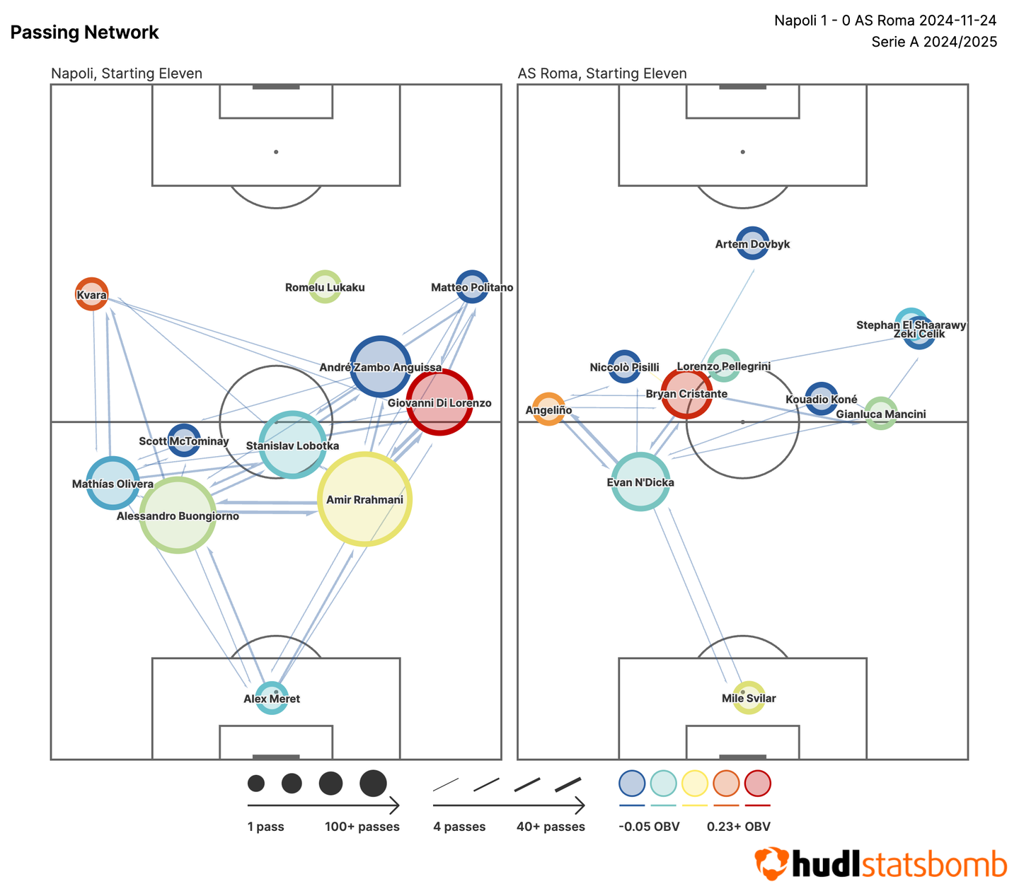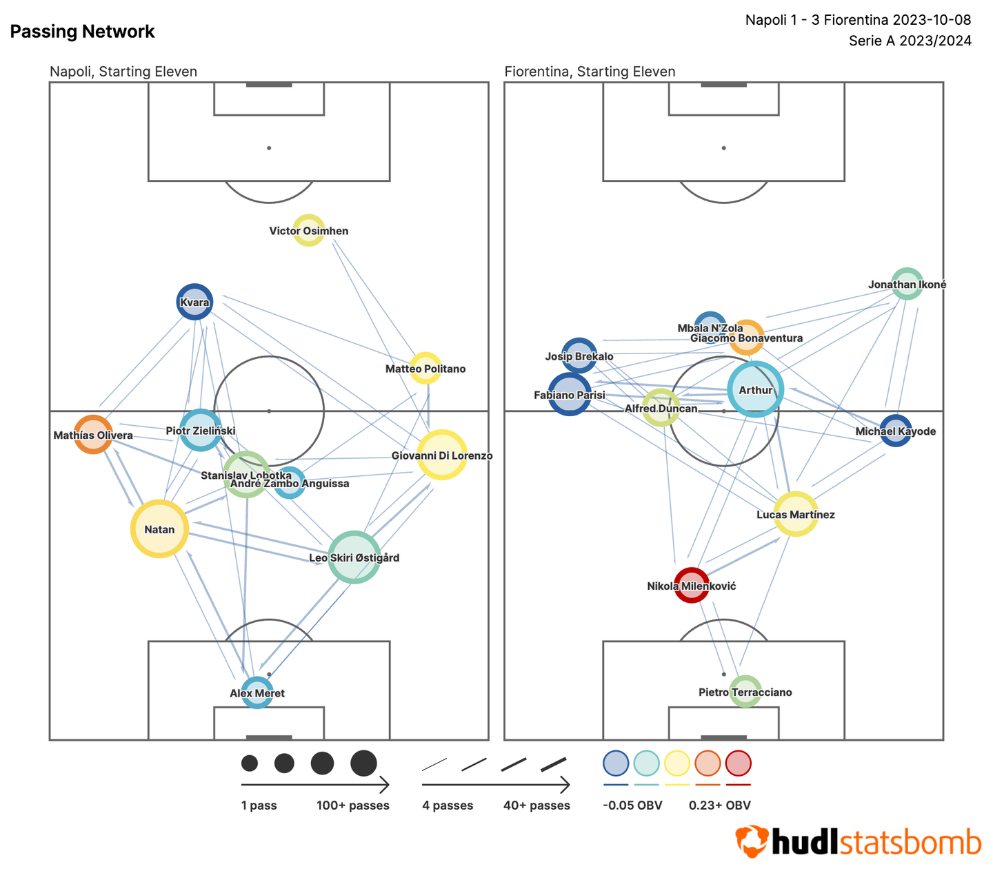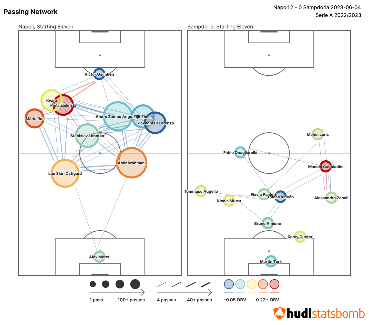Dietro questa apparenza, però, c’è un uso del georgiano peculiare, e molto diverso da quello che facevano i suoi predecessori. Forse è cambiato Kvara, ma è cambiato soprattutto il contesto attorno a lui: le zone in cui riceve il pallone - più centrali - e, soprattutto, la rete che ha attorno. Dalla stagione dello scudetto a oggi Kvara è diventato sempre più solo: la squadra gli ha tagliato la rete di supporto attorno, come se dovesse sempre cavarsela da solo. Un aspetto che si vede molto chiaramente nelle varie pass network. Questa sotto, per esempio, è della stagione con Spalletti. Il Napoli costruiva a sinistra la propria catena forte (nel DNA del club, dopo quella con Ghoulam e Insigne): Mario Rui era un fulcro forte del possesso, poi Zielinski e davanti a lui Kvara. Quando il georgiano riceveva e portava farlo poteva farlo con attorno questi giocatori ultra-associativi, abili negli smarcamenti e nel dialogo tecnico.