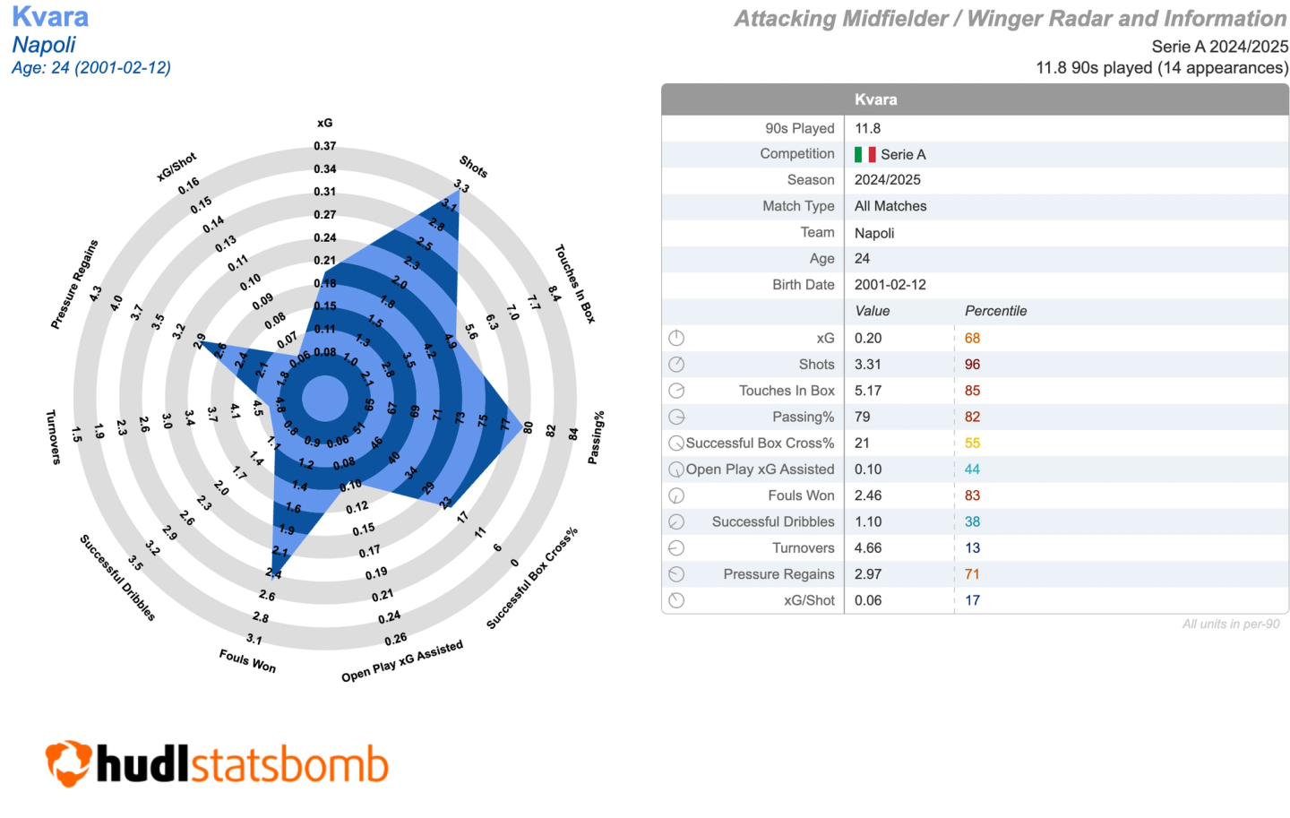 A volte Kvara sembra dover lottare da solo contro un esercito nemico, e il più delle volte ne esce sconfitto e frustrato. Non è chiaramente il calcio che gli piace e che lo diverte; ma da questa sua lotta il Napoli trae sempre vantaggio. Se guardiamo i suoi radar Statsbomb, l’OBV (on ball value) delle sue conduzioni - cioè quanto migliorano le capacità di fare gol della squadra - Kvara mantiene un valore molto alto anche quest'anno (94esimo percentile).