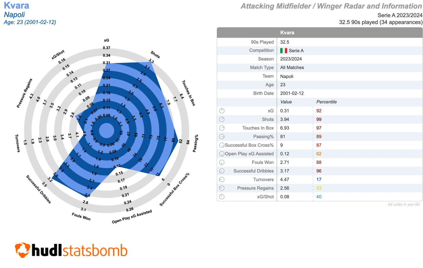 Rispetto alle scorse stagioni il calo dei numeri dei dribbling di Kvaratskhelia somiglia a un vero e proprio tracollo. Guardate questi radar Statsbomb. Lo scorso anno gli riuscivano 3,17 dribbling ogni 90 minuti, con un volume di tentativi più alto e con una percentuale buona del 54%, mentre l’anno prima con Spalletti gliene riuscivano un po’ di meno - ma su numeri tutto sommato simili.