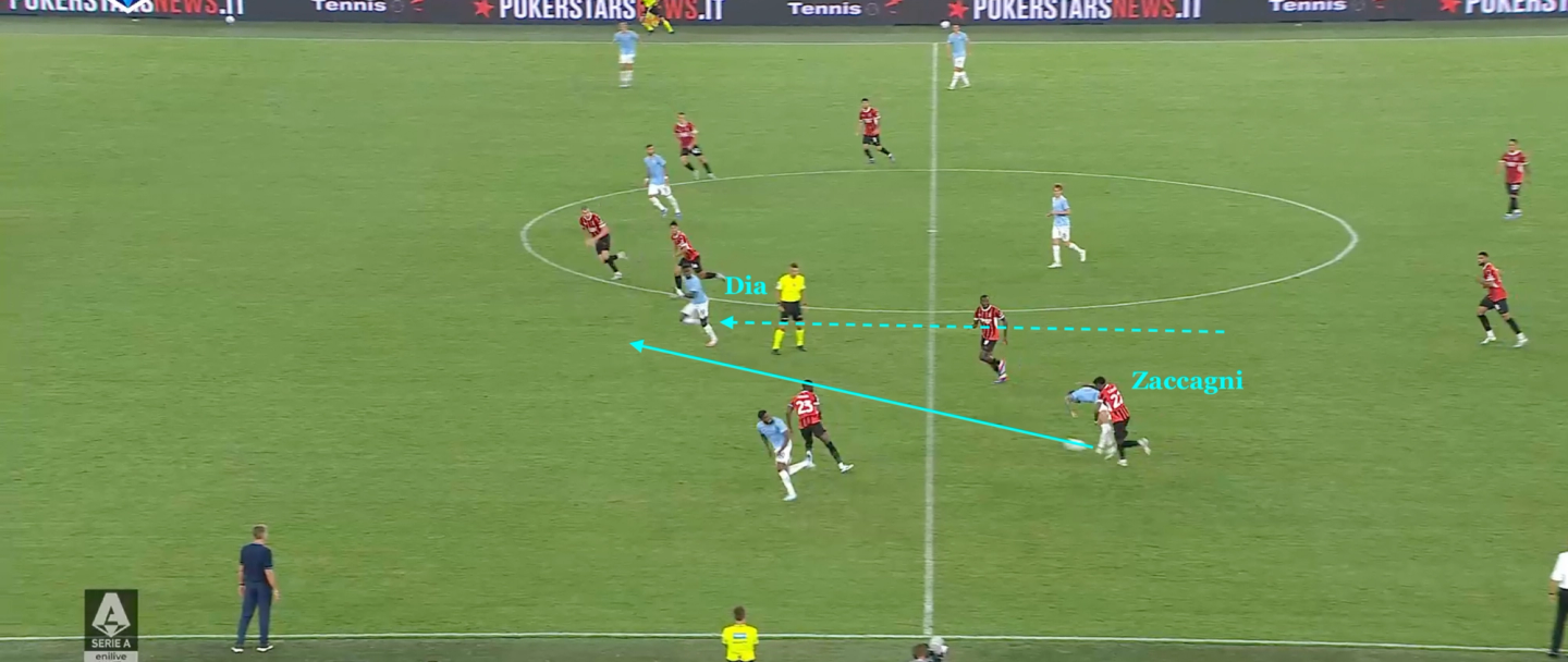 Un esempio di velo per liberare l'uomo in area, con Zaccagni e Dia sulla stessa linea di passaggio.