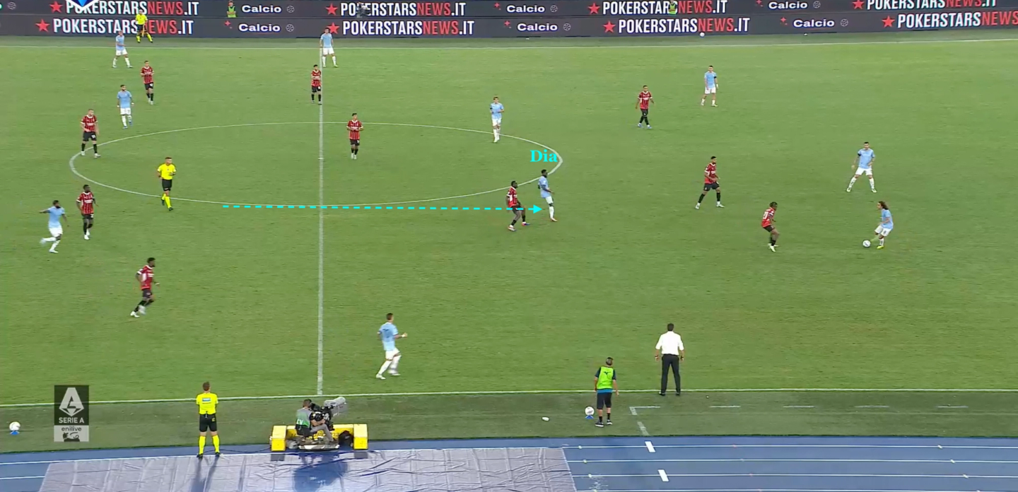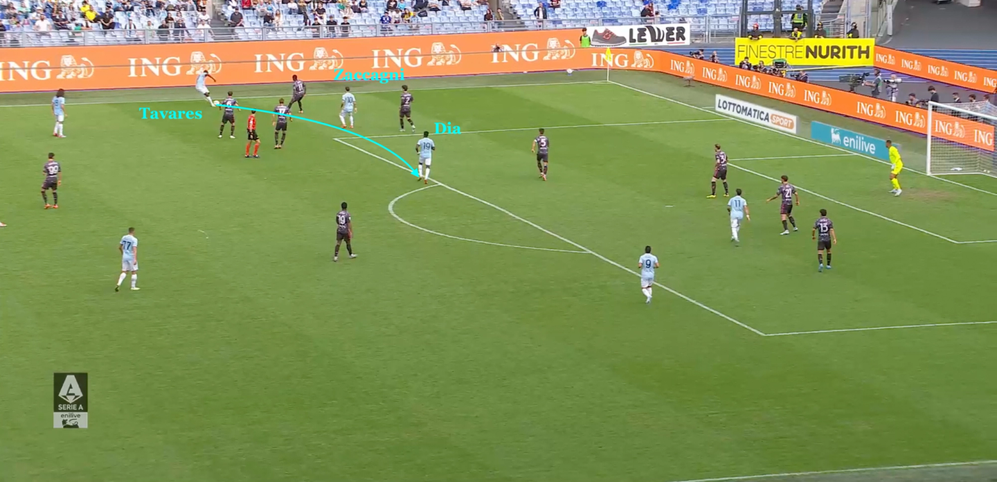 Forse è così che si spiega anche un’altra scelta controintuitiva, e cioè quella di mettere la coppia d’attacco in verticale anziché in orizzontale, e di chiedere di venire incontro a cucire al gioco non a Castellanos, a cui piace giocare tre le linee e associarsi coi compagni, ma a Dia, che invece a Salerno avevamo conosciuto per la precisione dei suoi movimenti in profondità alle spalle della linea avversaria. In questo modo la Lazio perde qualcosa nella precisione tecnica quando c’è da risalire il campo palleggiando (cosa che comunque gli interessa fare molto di meno rispetto al recente passato) ma ne guadagna in imprevedibilità nell’attacco dell’area, dato che Dia può entrarci in un secondo momento dopo aver contribuito alla fase di costruzione.