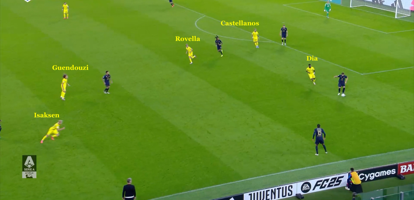 Se poi la Lazio non attacca subito l'area, ma la sua manovra torna indietro, è Castellanos che tende ad uscire fuori per partecipare alla rifinitura dell'azione.