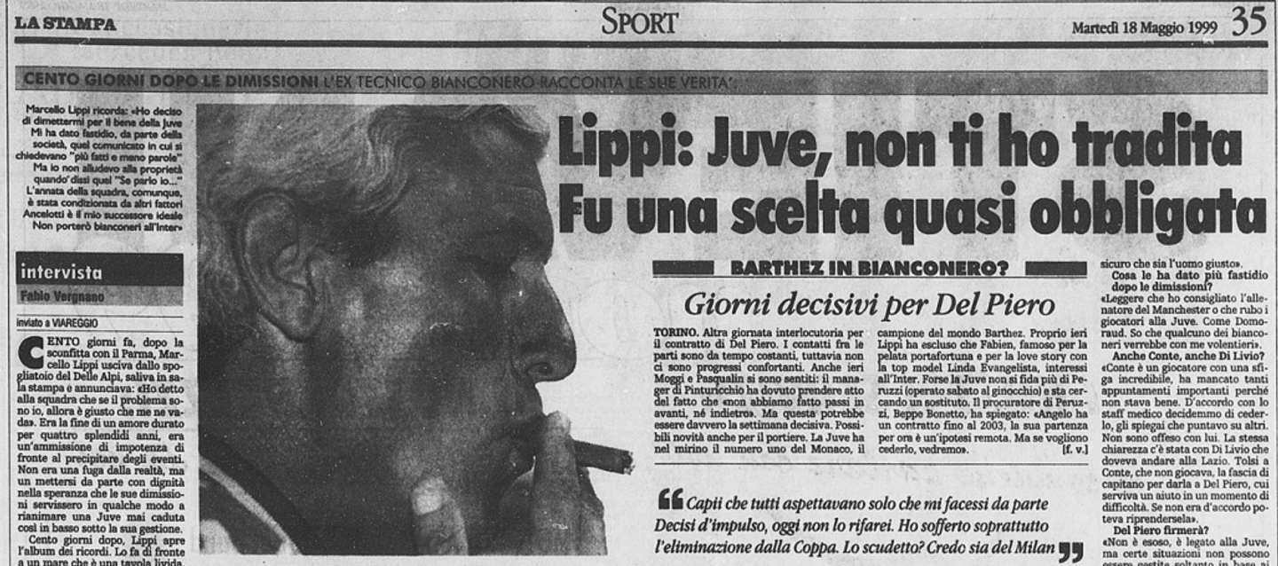 La fiera delle incomprensioni tra Marcello Lippi e l’Inter finisce così, con uno sfogo sconnesso alla prima giornata di campionato. Sarebbe tornato grande alla Juventus, vincendo anche il celebre Scudetto del 5 maggio 2002, e avrebbe rivendicato tutta la sua appartenenza bianconera a distanza di tempo da quella vittoria: «All’Inter non ero ben visto perché difendevo la mia juventinità, questo per loro non andava bene. Ad Appiano non feci molto bene, nessuno accettava il mio modo di giocare. Che soddisfazione vincere lo Scudetto con i bianconeri quanto tutti pensavano che lo vincesse l’Inter».
