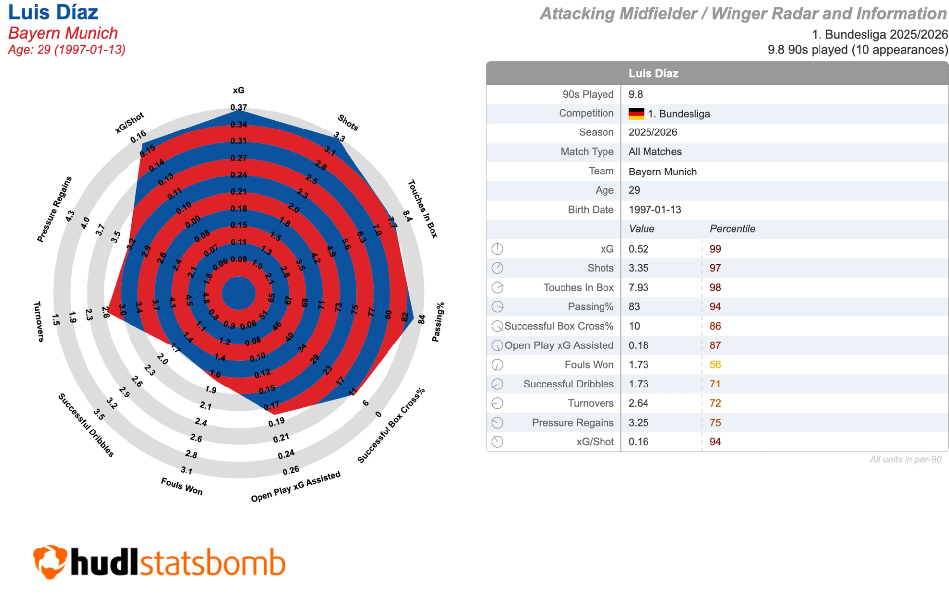 Questa mostruosa intensità mentale è ciò che rendeva Luis Diaz devastante in Premier League, e che lo sta facendo apparire fuori scala in Germania, al Bayern, dove si è trasferito in estate per 75 milioni di euro. Un aspetto sottovalutato del suo gioco è l’impegno senza palla: Luis Diaz è intenso anche quando c’è da lavorare in pressing. Al Liverpool era nel 90esimo percentile per palle recuperate tra gli attaccanti in pressing; quest’anno il volume del suo lavoro senza palla, ma in compenso calcia di più e più vicino alla porta.