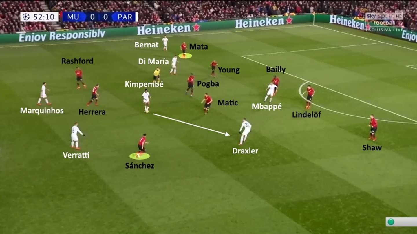 Kimpembé avanza palla al piede e si lascia dietro tre avversari, Mata si è abbassato a seguire Bernat, mentre Sánchez è rimasto più alto sulla linea di Rashford. Di fianco a Matic si libera Draxler e sullo sviluppo dell’azione il PSG conquista il calcio d’angolo che sblocca la partita.