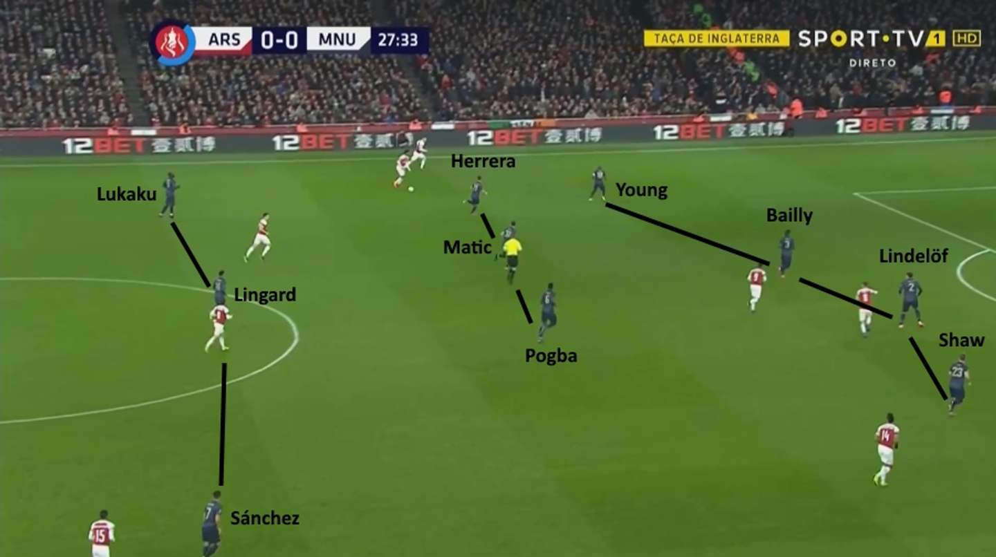 La soluzione con Lingard dietro due attaccanti che partono larghi è quella che assicura maggiore fluidità posizionale, perché l’attaccante inglese non è un trequartista classico e non attira su di sé il pallone come un falso nove creando spazi per i tagli degli attaccanti. Lingard è però molto abile a trovare la ricezione negli spazi offerti dallo schieramento avversario e ama molto inserirsi senza palla. Oltre alla partita contro il Tottenham, Lingard ha giocato in posizione centrale in FA Cup contro l’Arsenal, avendo ai suoi fianchi Lukaku e Sánchez, che in ripartenza erano i riferimenti per risalire il campo. In quell'occasione lo United aveva vinto 3-1 e Lingard aveva segnato un gol su assist di Lukaku.