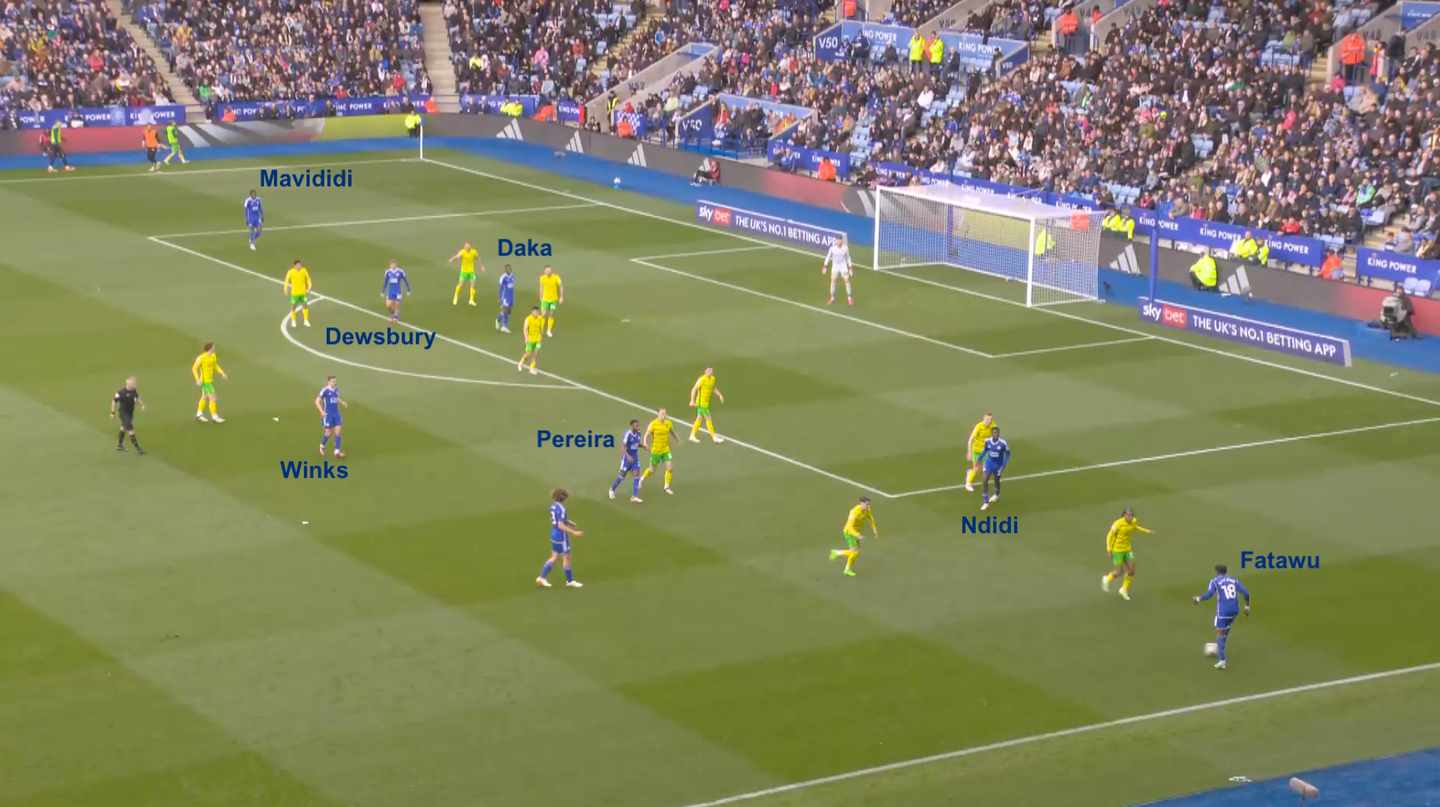 Qui contro il Norwich le due mezzali Dewsbury-Hall e Ndidi sono in linea col tridente (c’è Daka al posto di Vardy) e si può vedere Pereira nel mezzo spazio destro e altissimo, invece che al centro accanto a Winks come da piano A. È il preludio ad un gol di Dewsbury-Hall.