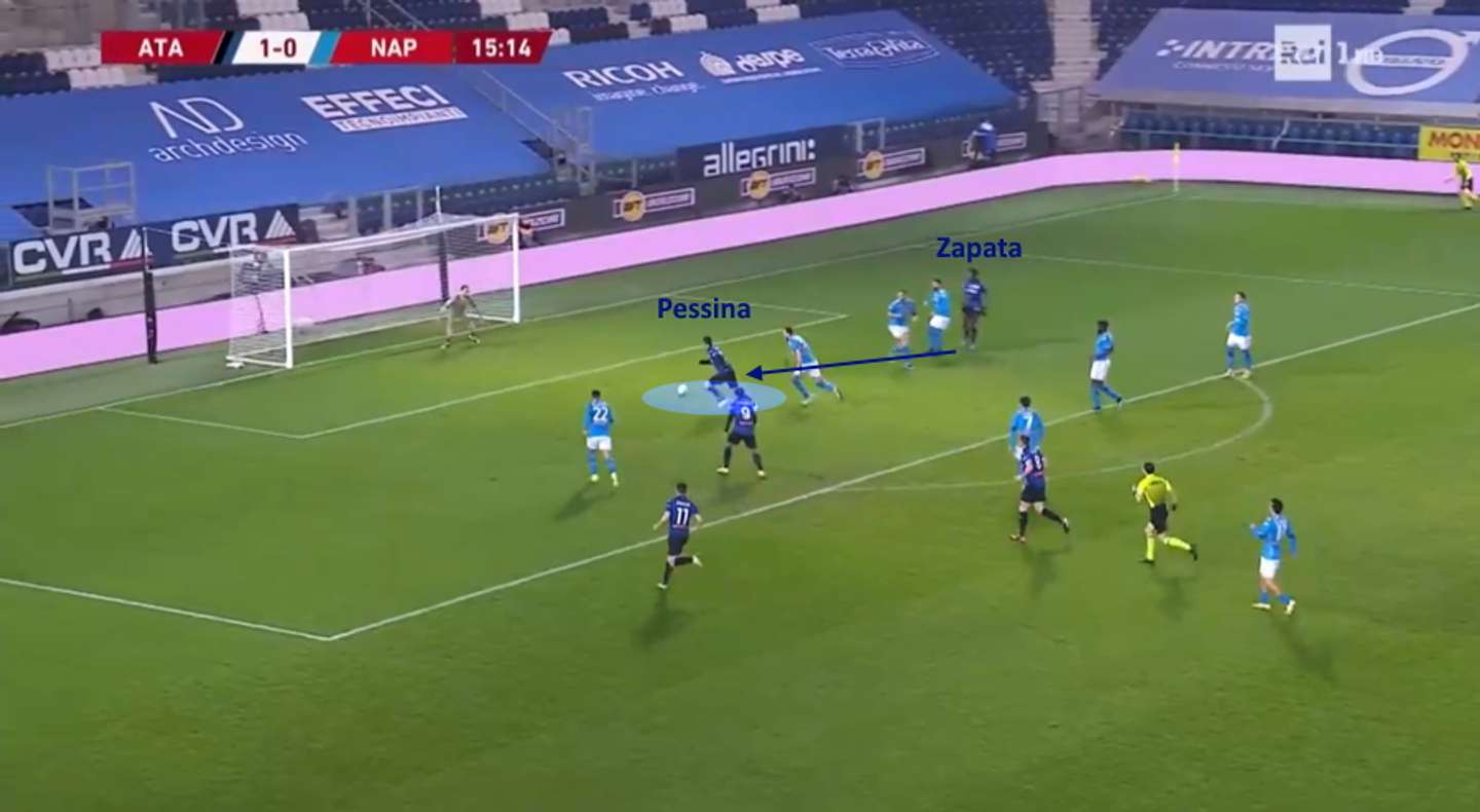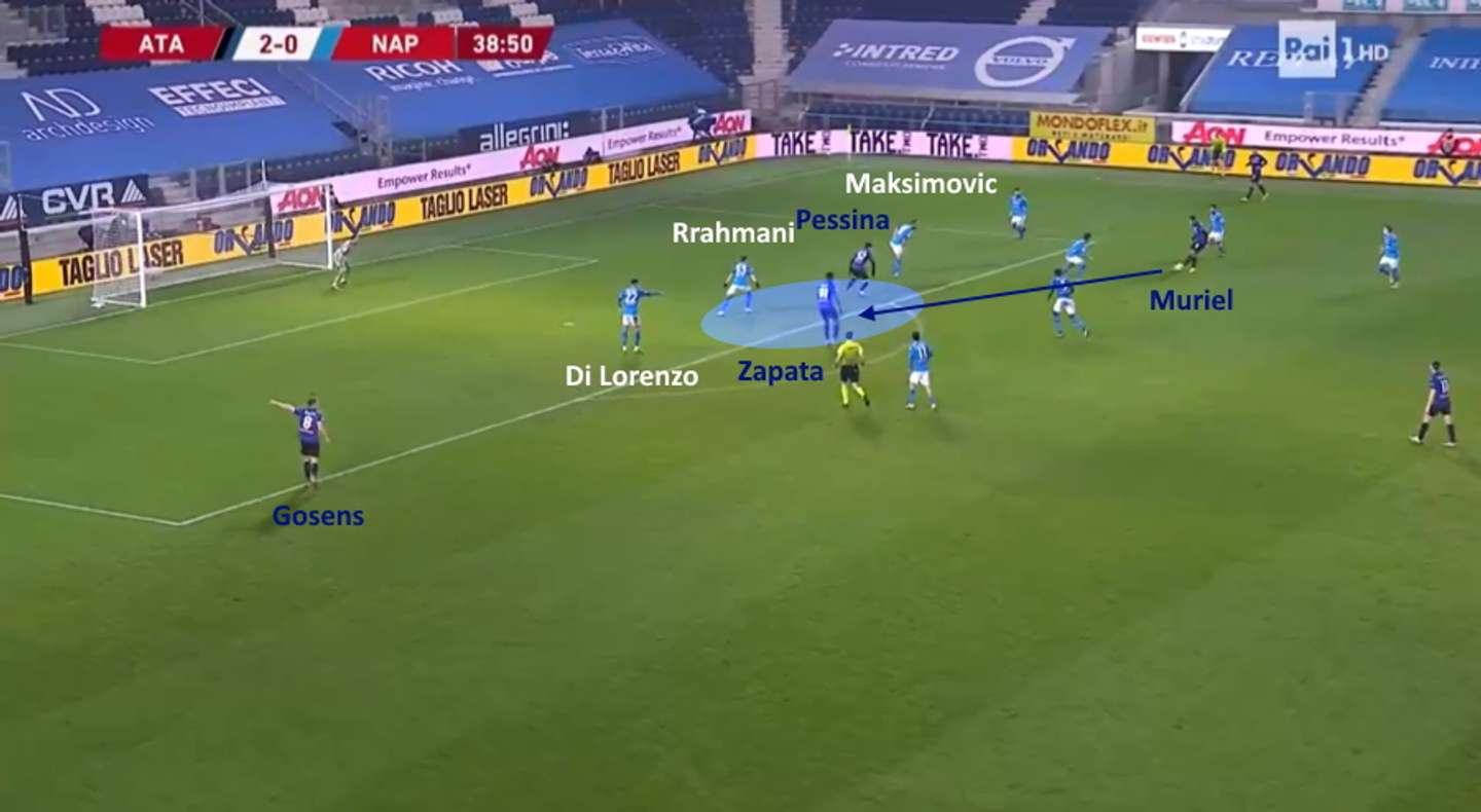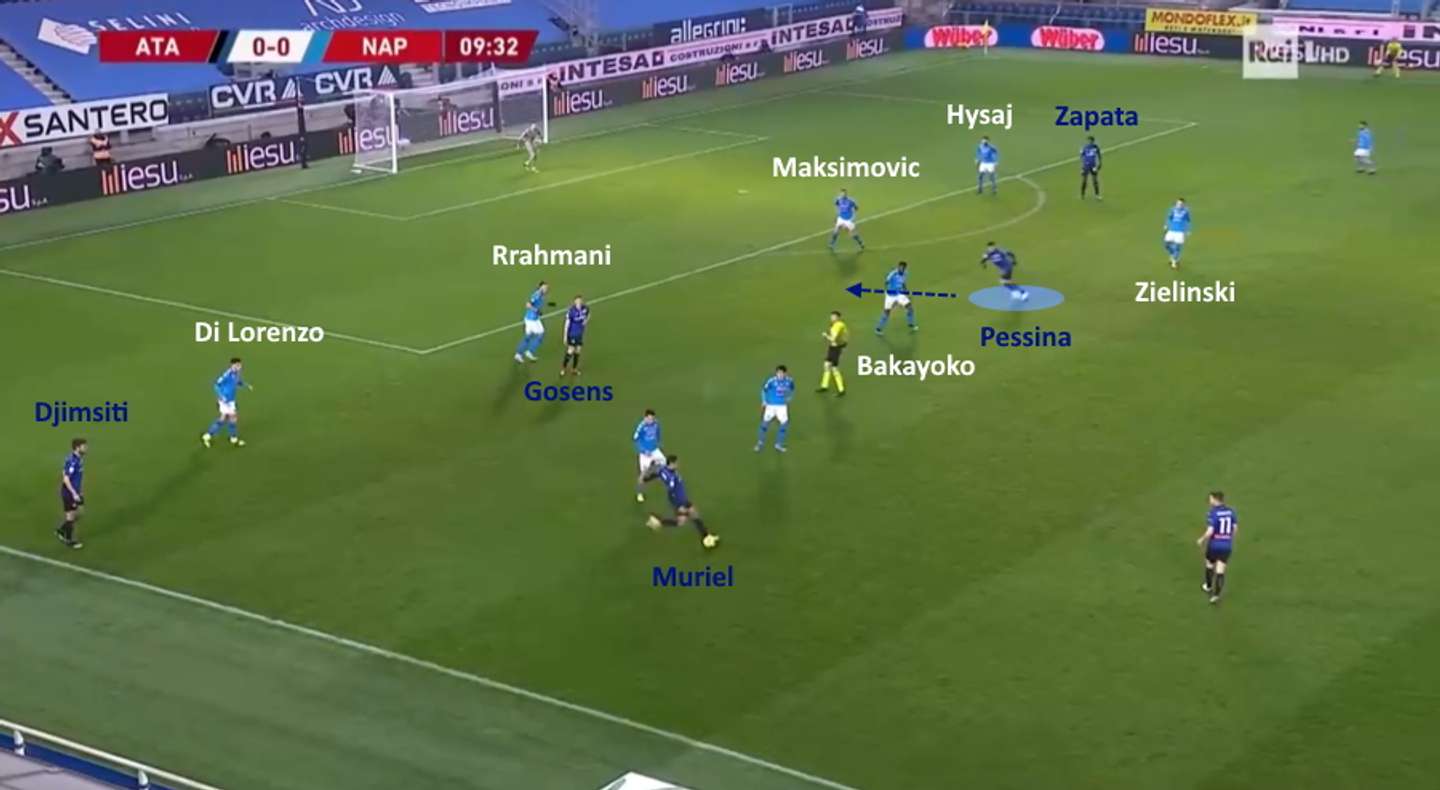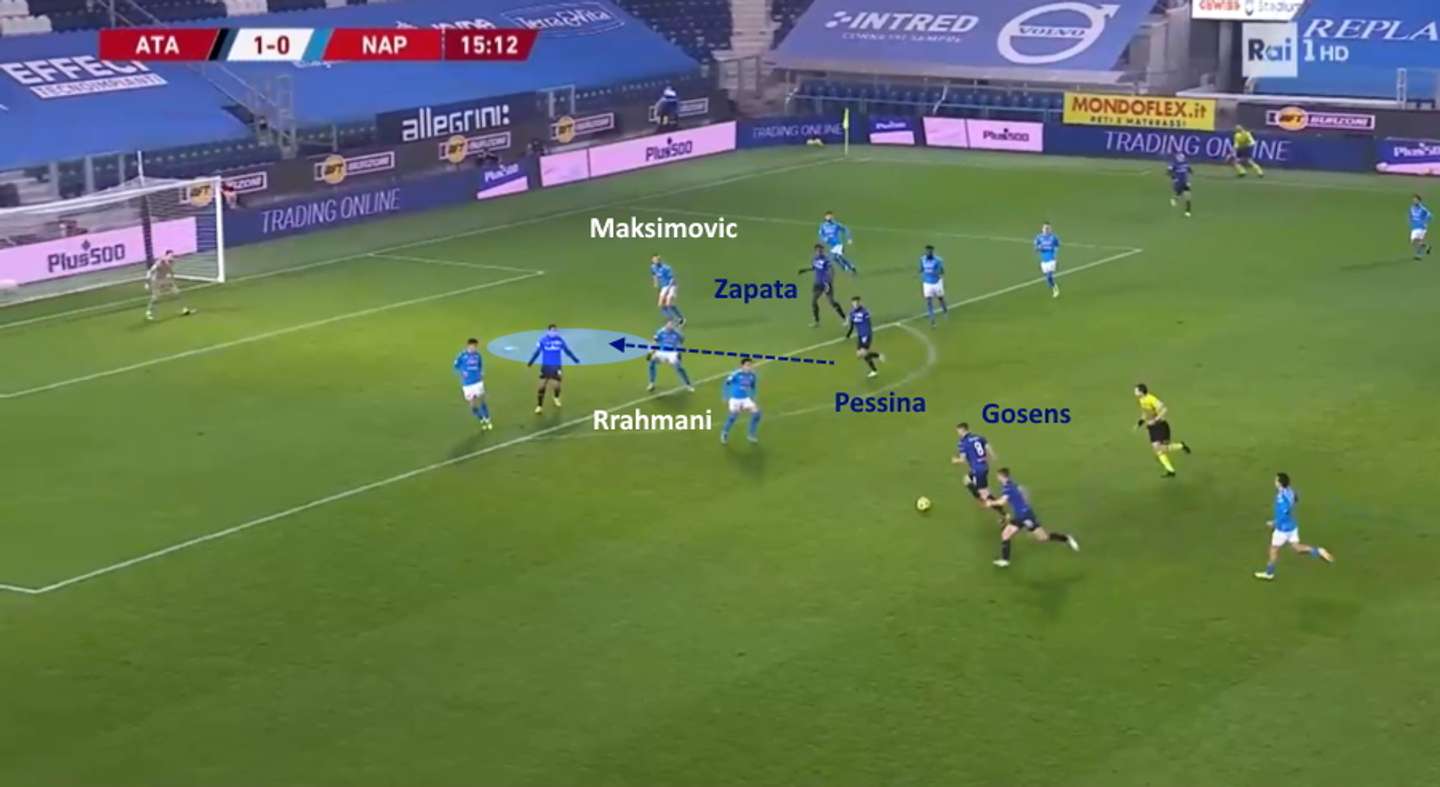 Allargata la difesa del Napoli, Pessina era il più svelto a vedere e occupare lo spazio che si creava al centro, tra Rrahmani e Maksimovic. In occasione del primo gol, segnato da Zapata, in cui l’Atalanta manovra in orizzontale da sinistra a destra con la difesa del Napoli schierata, Rrahmani e Maksimovic sono distanti e in quello spazio va a inserirsi Pessina.