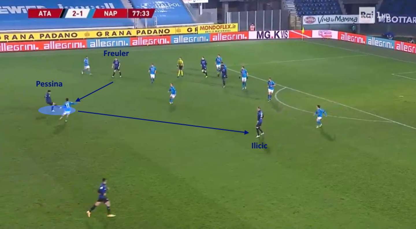 All’inizio il trequartista dell'Atalanta non sembra nemmeno voler partecipare all’azione. Caldara si appoggia a sinistra su Freuler e Pessina resta indietro in copertura. Poi però la difesa del Napoli è schierata, l’azione rallenta e allora il trequartista atalantino avanza per ricevere il retropassaggio di Freuler, muovendo la palla di prima alla sua destra verso Ilicic.