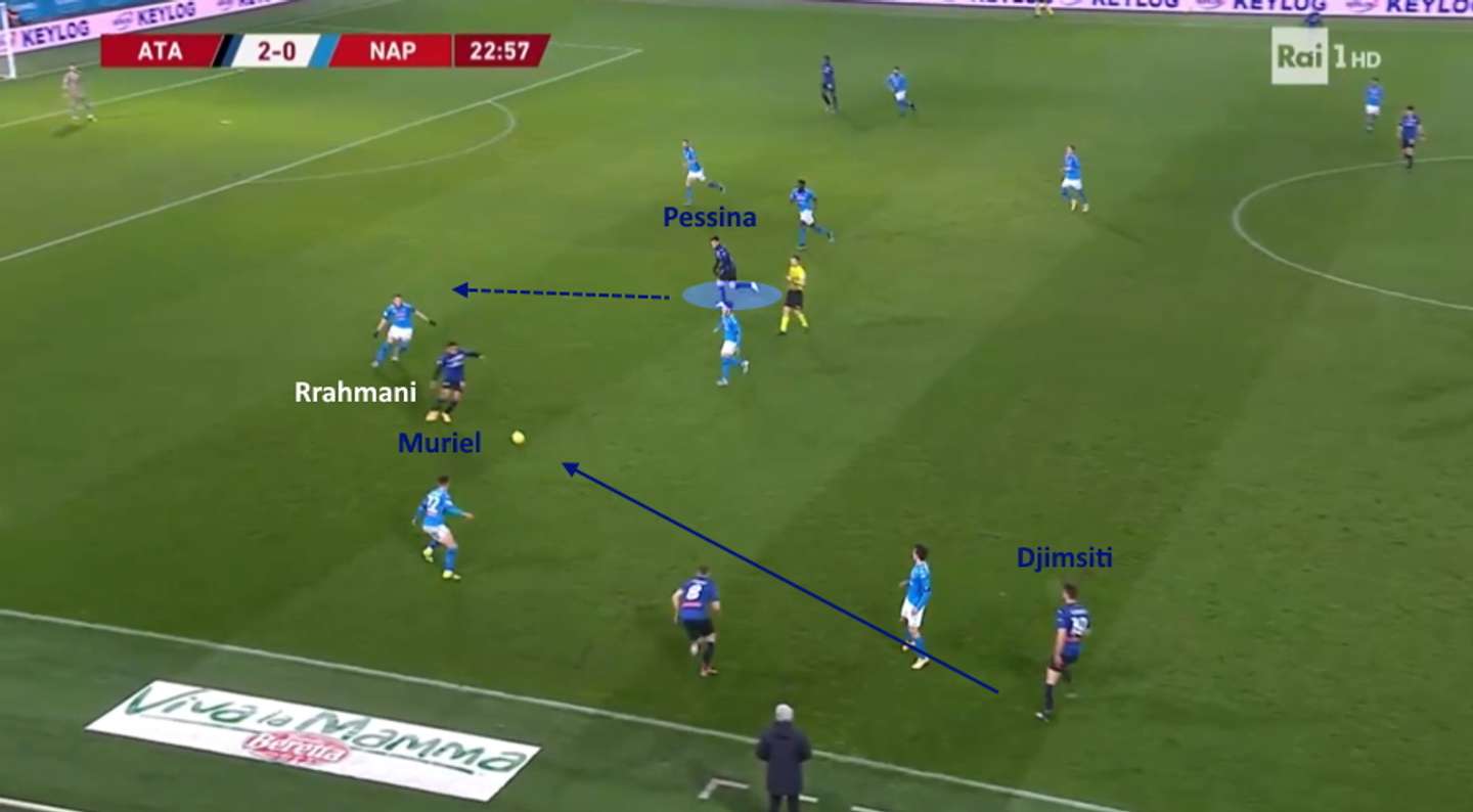 E una volta che Muriel aveva la palla, e forzava quindi un’uscita dalla linea difensiva del Napoli (in particolare di Rrahmani), Pessina era sempre pronto a inserirsi nello spazio che si creava. Nell'immagine qui sotto, al minuto 23, Muriel si abbassa per ricevere la palla da Djimsiti, viene seguito da Rrahmani e nello spazio alle spalle del difensore kosovaro va a inserirsi il trequartista nerazzurro. Muriel torna indietro e riesce a girarsi ma l’azione si interrompe perché Rrahmani lo stende.