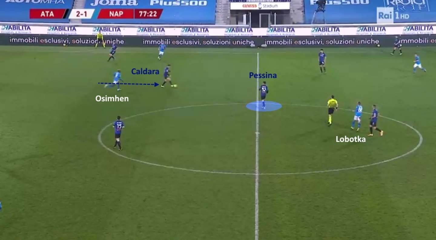 Tornando quindi al suo secondo gol, all’inizio della ripartenza quando Caldara anticipa Osimhen, Pessina è a centrocampo, perché poco prima aveva seguito Lobotka e si era staccato per dare copertura al centro.