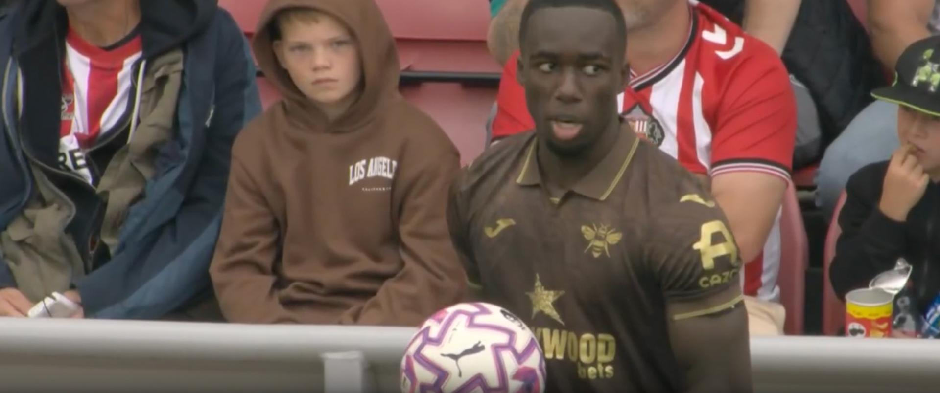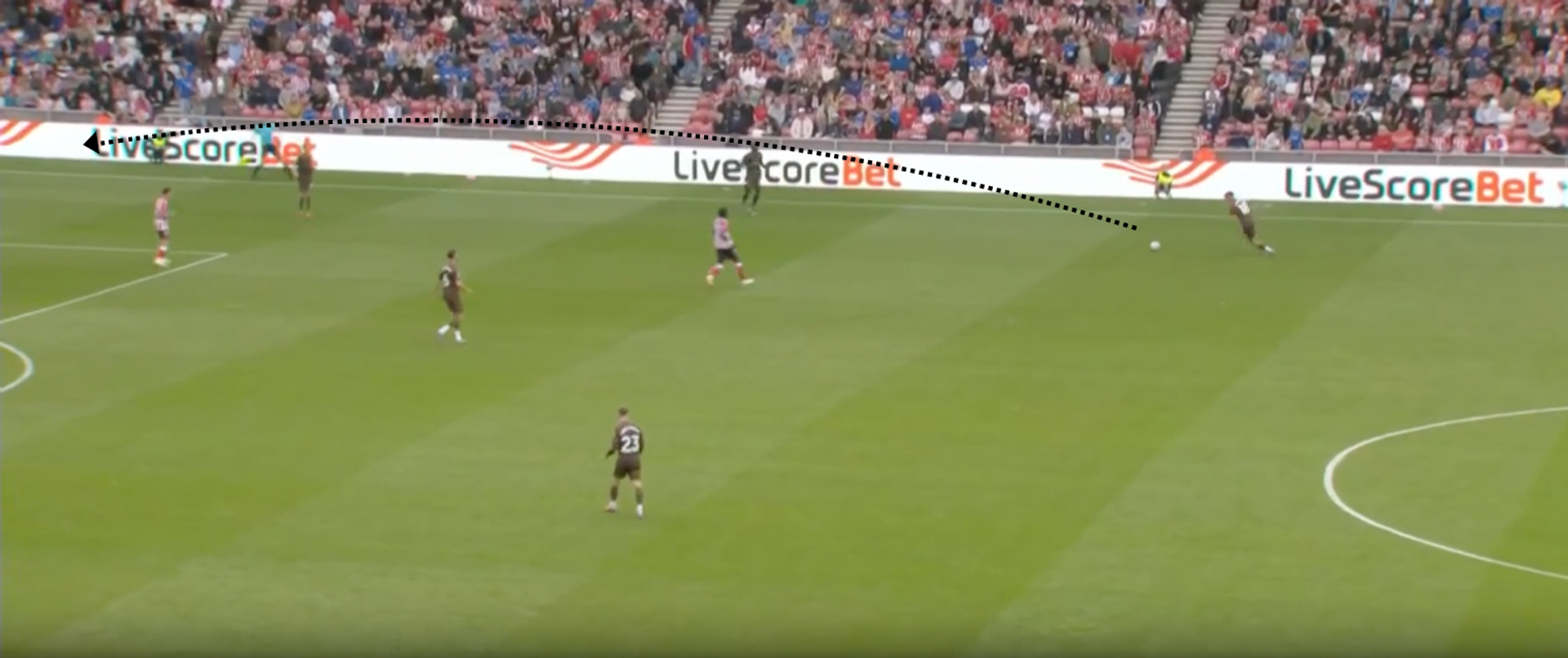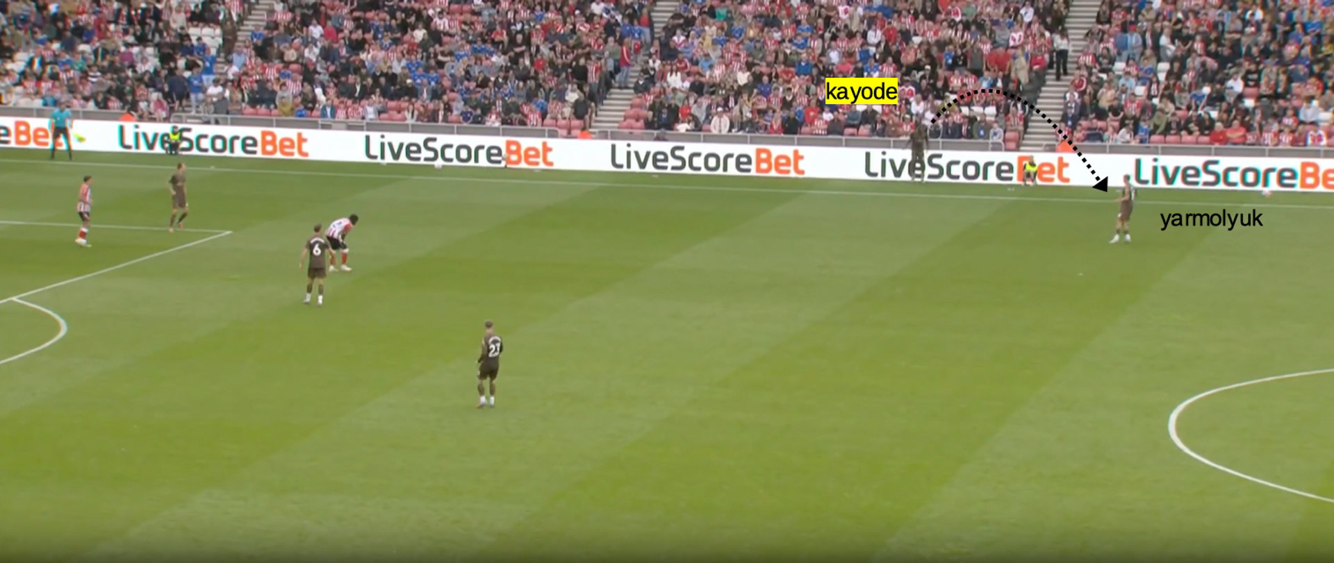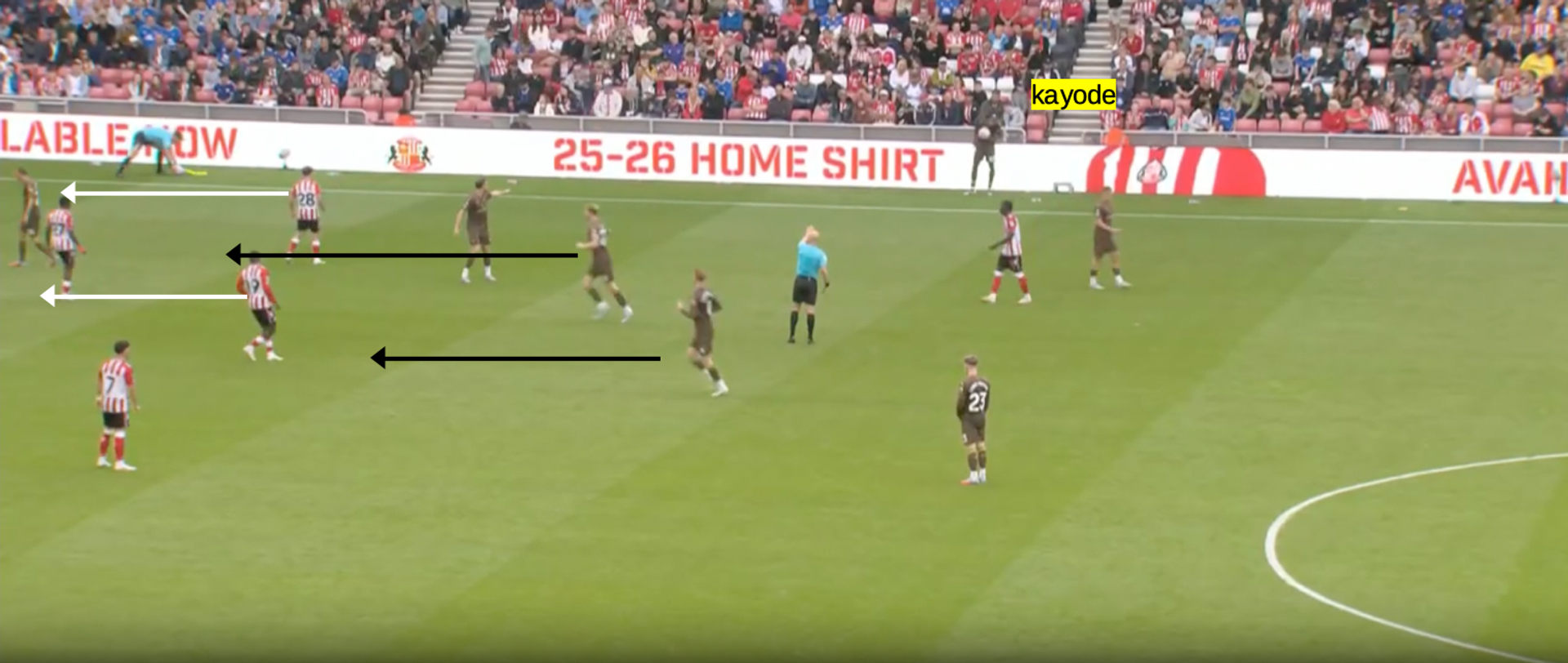 All’inizio del secondo tempo contro il Sunderland, ad esempio, il Brentford ha avuto una rimessa all’altezza della trequarti. Appena Kayode ha preso la palla in mano e appena i suoi compagni sono avanzati, tutto il Sunderland si è schiacciato nella propria area.