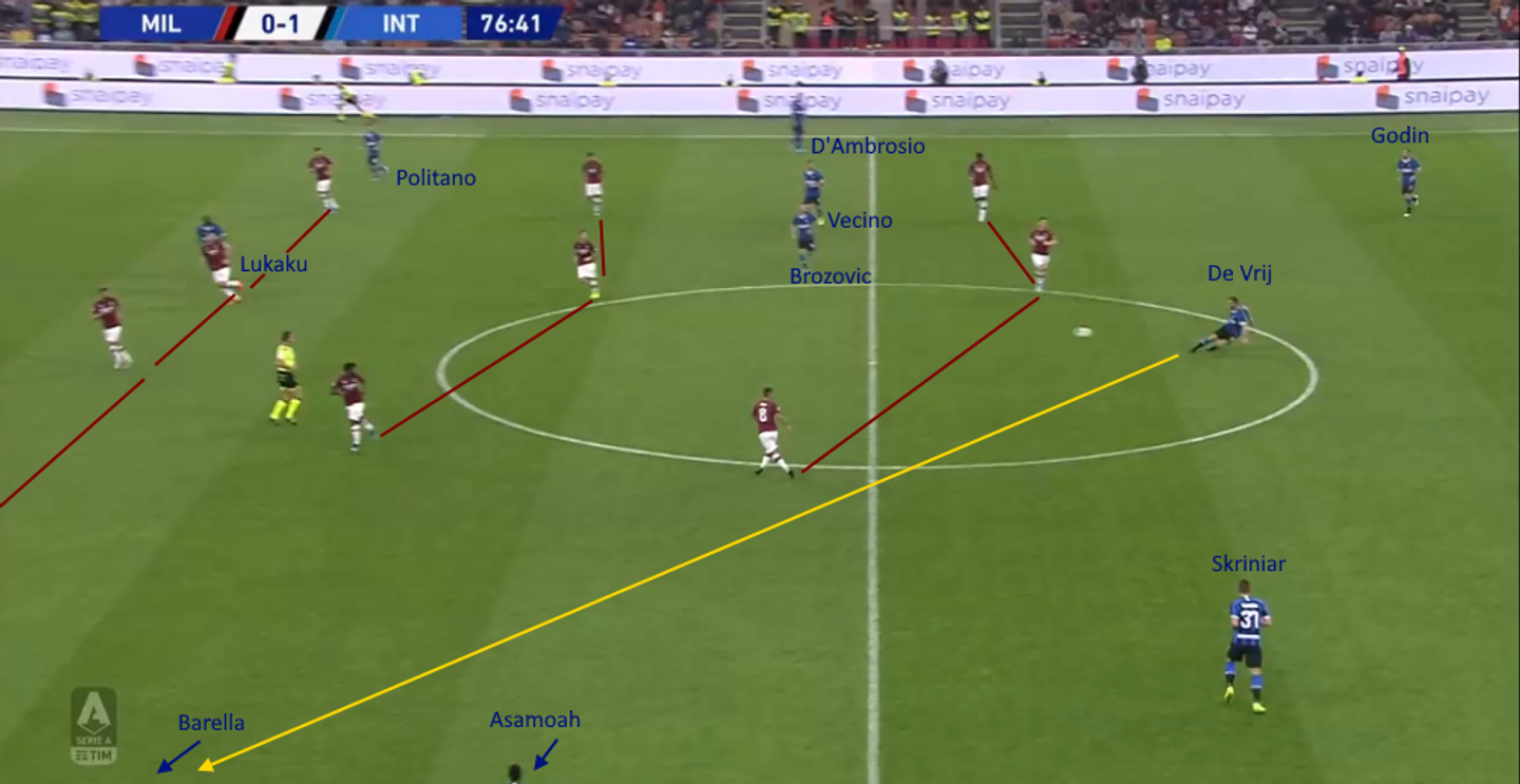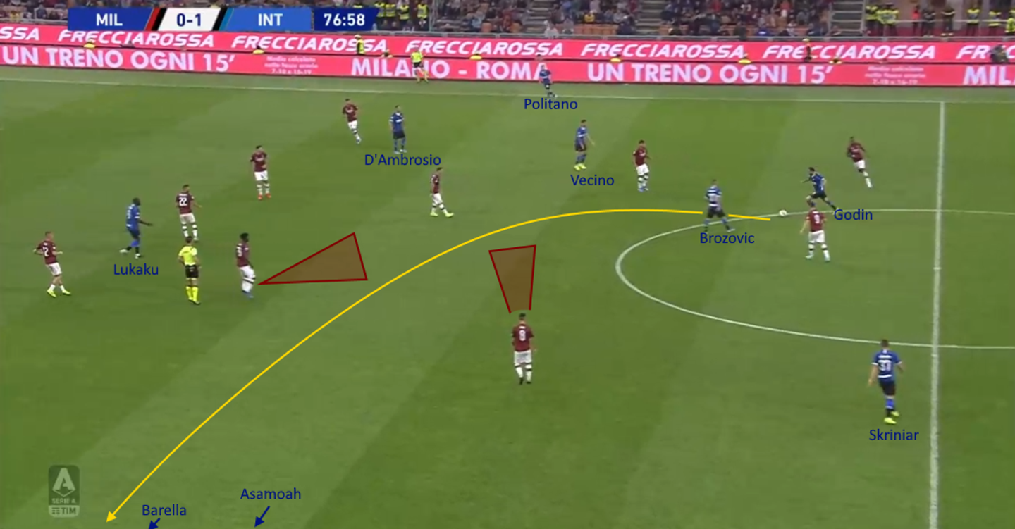 In quel caso il passaggio del difensore olandese era stato facilmente leggibile e il Milan aveva accompagnato bene l’azione, portando Kessié a stringere verso Barella. Senza spazio da attaccare, Barella era tornato indietro con pazienza mettendo il pallone nella solita cassaforte composta da Skriniar, Brozovic e De Vrij, riportandosi sulla fascia destra, dove Godín ha mandato in crisi per un attimo le linee di difesa del Milan con una finta. E quell’attimo è bastato a rendere Barella, di nuovo isolato a sinistra, per sfuggire a Kessié, liberare lo spazio per la sovrapposizione di Asamoah e servire il cross morbido per il 2-0.