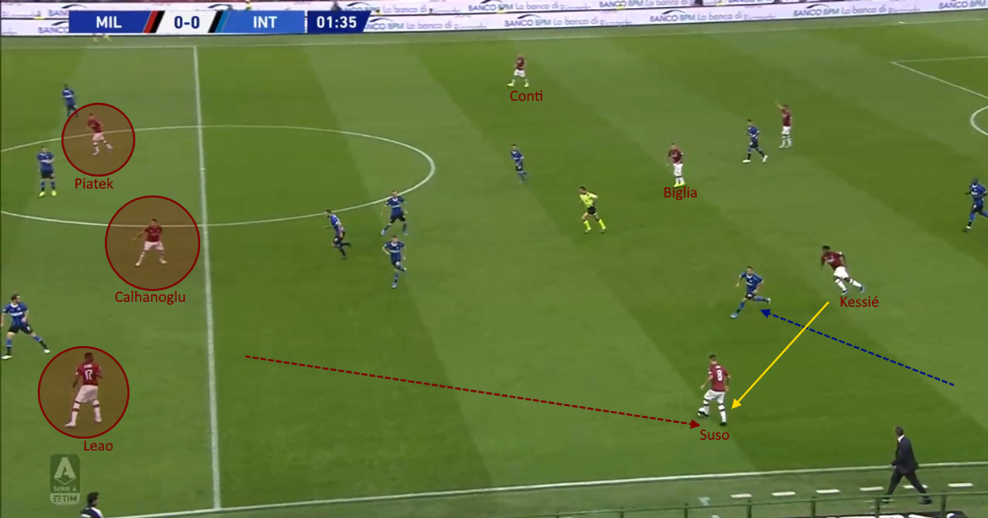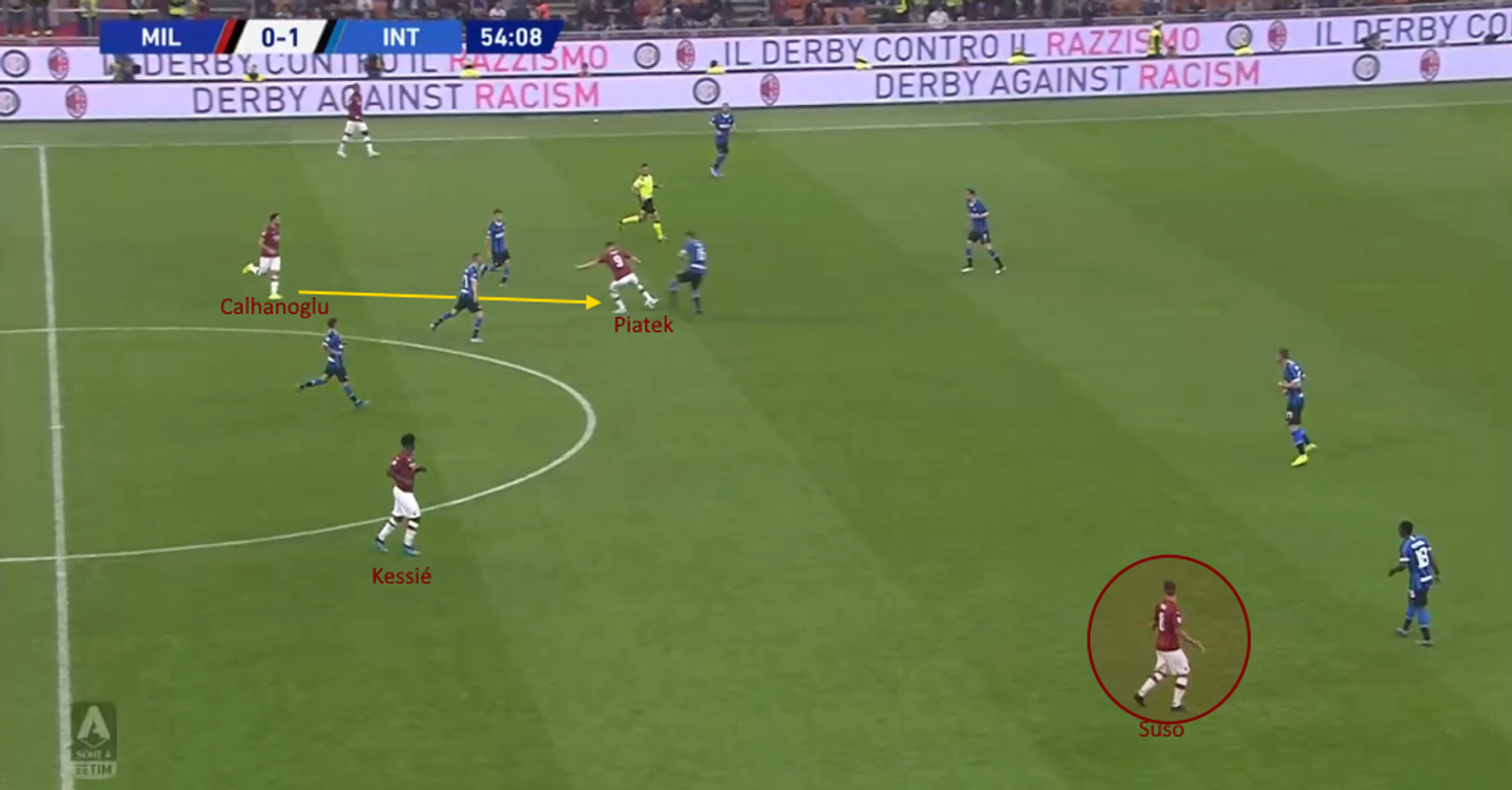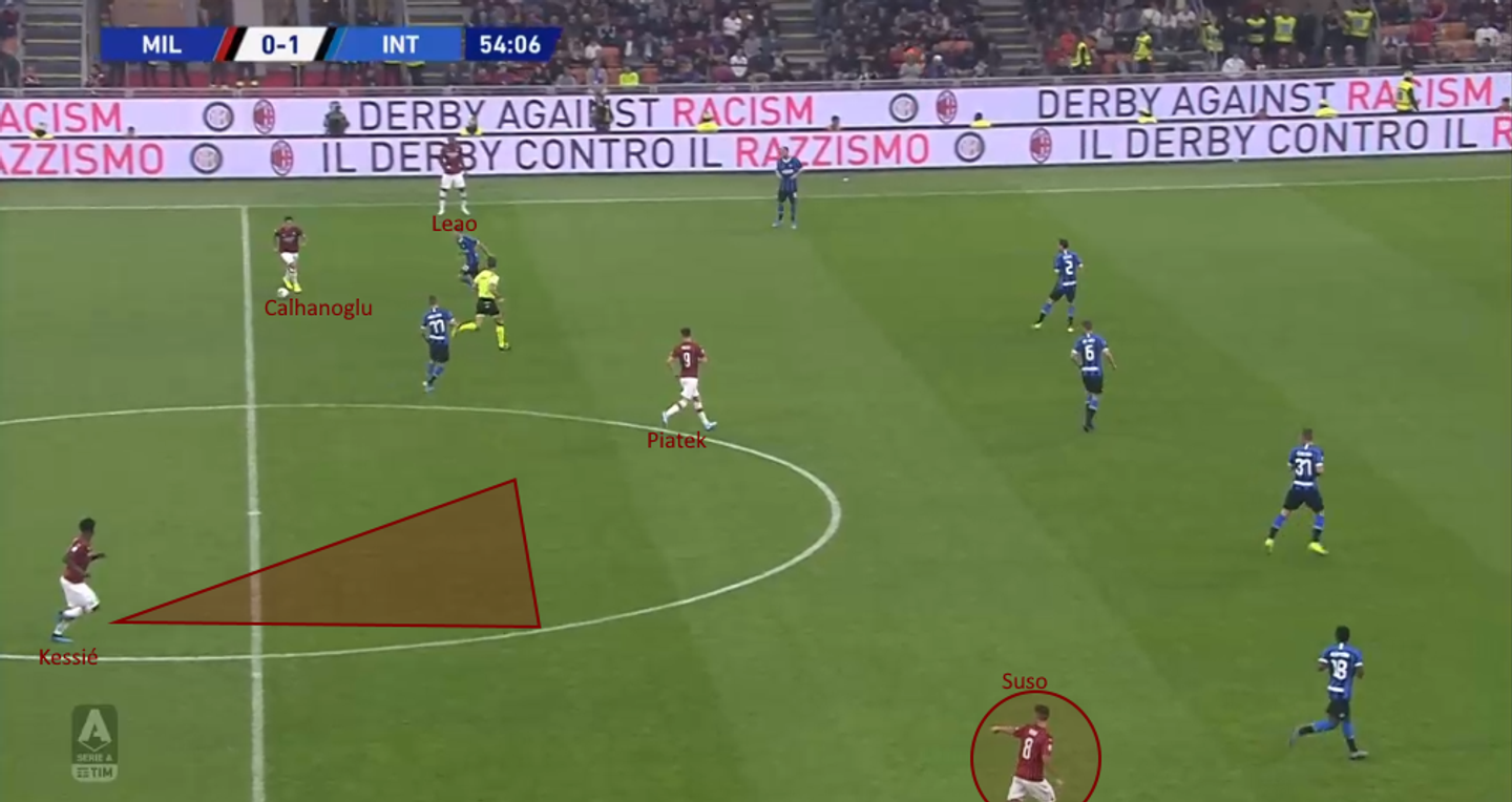 La posizione ibrida di Suso ha comunque creato qualche problema iniziale alla difesa dell’Inter, qui lo spagnolo si abbassa sulla fascia sinistra, dove raramente osa spingersi, riceve da Kessié e crea le condizioni per attaccare in parità numerica la difesa dell’Inter.