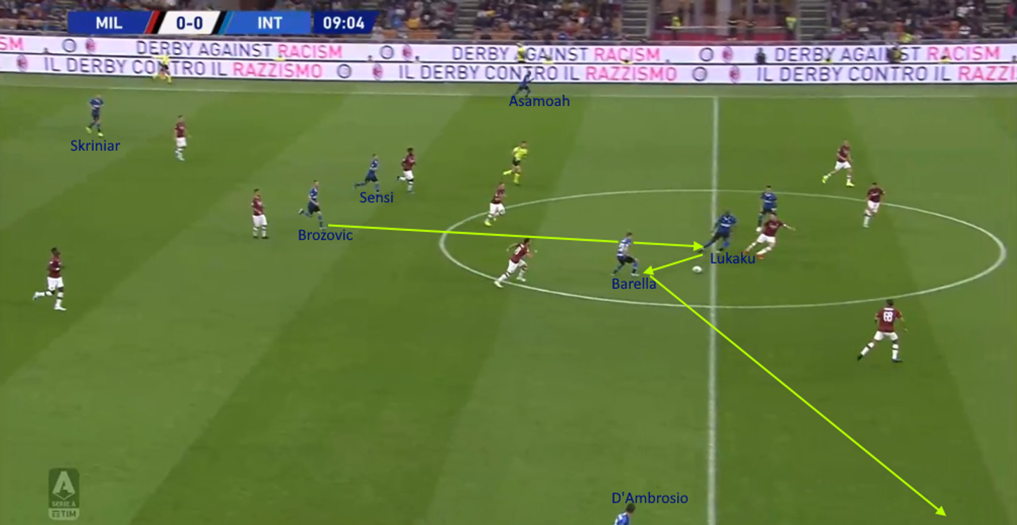 I veri playmaker dell’Inter sono infatti gli esterni di fascia, che rappresentano lo sbocco più immediato per la manovra e quindi il più invitante per le difese avversarie. Tanto il Milan quanto lo Slavia Praga martedì hanno provato a indirizzare verso le fasce i possessi dell’Inter isolando le mezzali con le marcature a uomo, di modo da obbligare Asamoah e D’Ambrosio a tentare il passaggio diagonale verso le punte, che solitamente coincide con un movimento a esca di Lautaro intorno a Lukaku atto a disorientare le marcature. L’Inter ha cercato con insistenza queste soluzioni anche nel Derby senza però ricavarne opportunità: un po’ per i controlli imprecisi di Lukaku, un po’ per l’intesa ancora da affinare tra i due attaccanti, un po’ per la grande densità centrale che il Milan ha opposto, trovando ancora buone risposte dalla coppia Romagnoli - Musacchio.