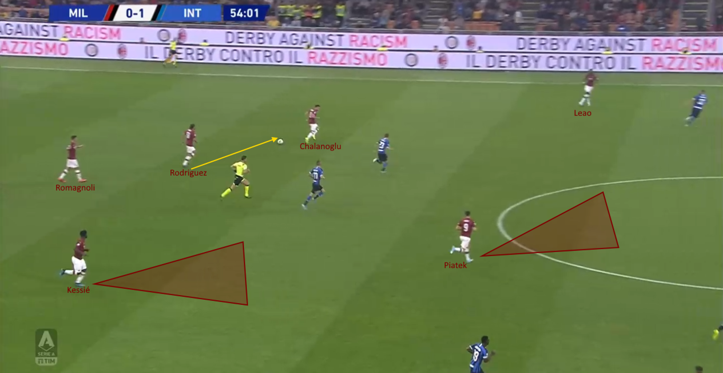 La fase di possesso del Milan è ancora un cantiere aperto: qui Rodríguez conduce una transizione interessante ma preferisce appoggiarsi a Calhanoglu, anche il turco ignora le opzioni a disposizione e porta il pallone per sette lunghi secondi prima di appoggiarsi a Piatek ingolfato tra i difensori dell’Inter. Il polacco sbaglia il controllo e perde il pallone, nel disappunto di Suso.