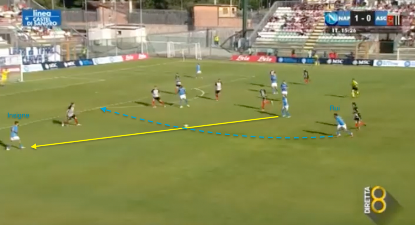 Mentre la palla viaggia tra Lobotka e Insigne, Mario Rui vede lo spazio tra terzino e centrale difensivo e scatta in avanti da una posizione più stretta.