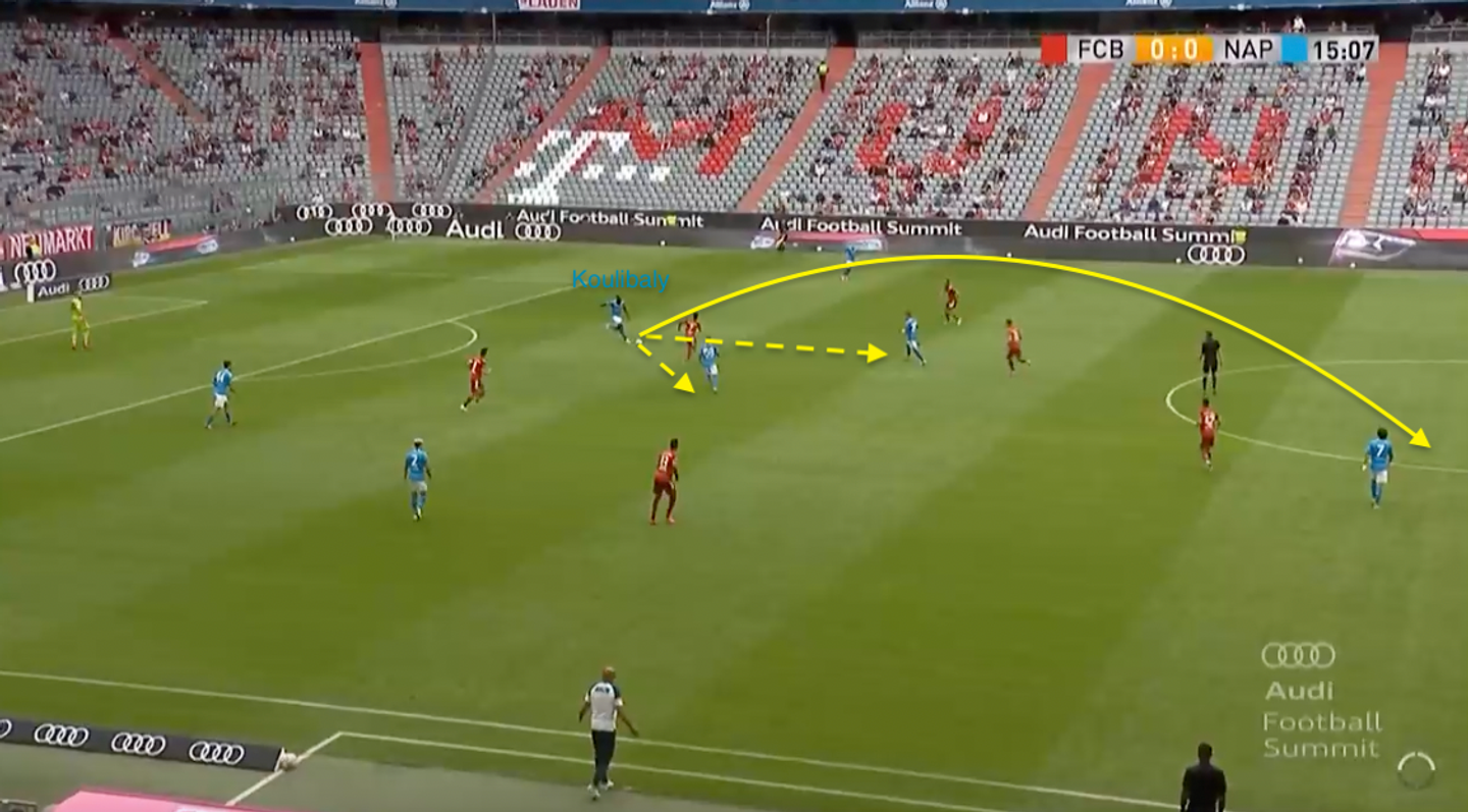 Koulibaly non ha appoggi centralmente sul corto, decide quindi di andare lungo su Elmas. Se c’è la possibilità si risale il campo in fretta, non si gioca lateralmente né all’indietro.