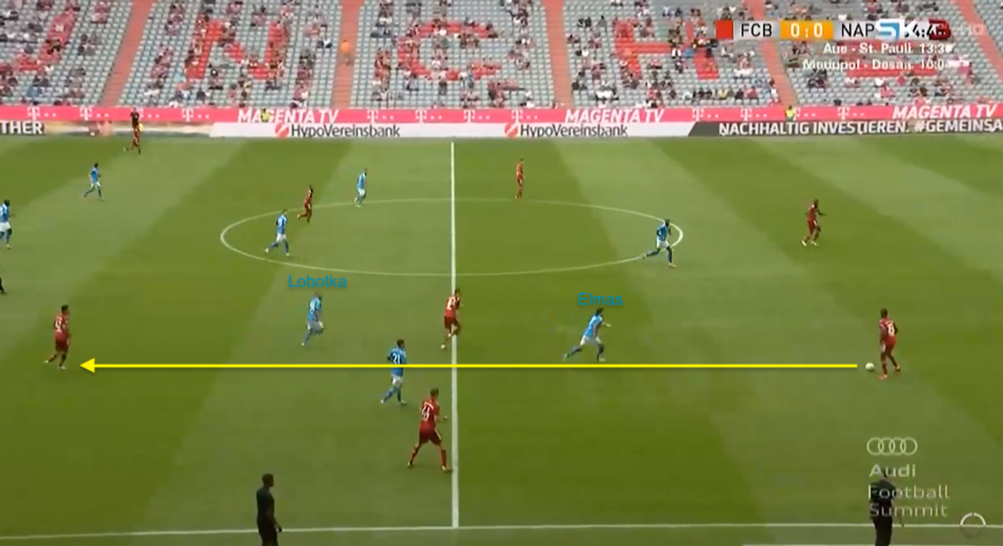 Le occasioni per attaccare in campo lungo non mancheranno al Napoli. Nel precampionato e di partita in partita, il Napoli ha cambiato atteggiamento, passando per un controllo ossessivo degli spazi contro avversari di blasone, come il Bayern; oppure ha optato per tentativi di recupero alto del pallone contro avversari più abbordabili, come l’Ascoli. Non è che contro il Bayern il Napoli non abbia provato a pressare, ma è sembrato che i trigger, gli eventi che scatenano la pressione, non fossero stati compresi allo stesso modo da tutti i giocatori. Ne è venuta fuori una pressione disarmonica, facile per il Bayern da bucare. Spalletti a un certo punto dalla panchina ha chiesto di smettere di tentare, e di restare piuttosto stretti e bassi in controllo della zona centrale del campo. Anche contro il Wisla, squadra che ha già iniziato il proprio campionato ed è più avanti nella preparazione, il Napoli ha spesso preferito cedere il controllo della palla.