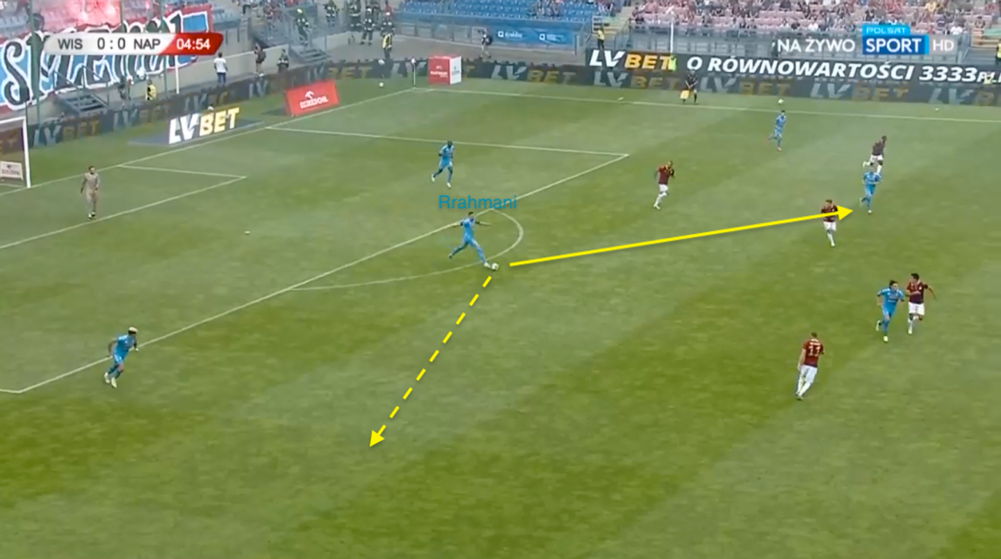 Rrahmani ha un passaggio semplice a destra verso il terzino Malcuit. Sceglie invece di andare per la giocata codificata sul perno basso di centrocampo, Lobotka. Il pallone viene letto e intercettato per il gol del momentaneo 1-0 per il Wisla.