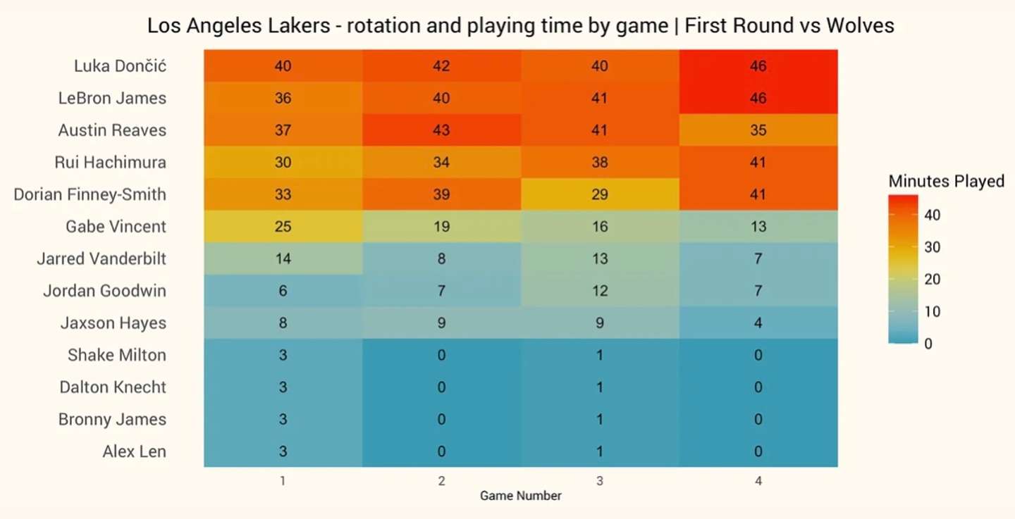 Non è infatti solo Dončić ad avere sulla coscienza questa partita, anche Redick dovrà riflettere sulla gestione che ha avuto sulla partita, specialmente delle rotazioni. È la prima volta nella play-by-play era (quindi dal 1997 ad oggi) che una squadra in una partita di playoff non cambia un singolo giocatore del quintetto per 24 minuti consecutivi, ovvero, in questo caso, i 24 minuti conclusivi della gara. Il roster dei Lakers non è certo il più profondo della lega, anzi, ma pensare che si possa mantenere alta l’intensità a queste condizioni è chiedere davvero troppo. Quattro giocatori sopra i quaranta minuti in campo, di cui due a 45 e 46, roba da Thibodeau d’antan che inevitabilmente porta a vista appannata e gambe che cedono nel finale.