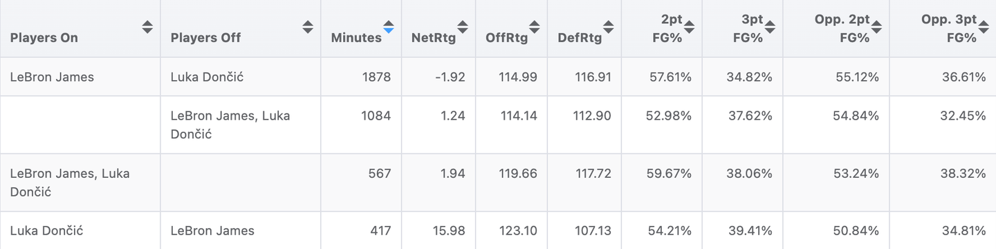 Nei 1878 minuti giocati insieme da LeBron James e Luka Dončić in regular season, i Los Angeles Lakers hanno avuto un rendimento offensivo stellare. Per quanto relativamente poco possa valere un paragone del genere, se avessero giocato insieme fin dall'inizio sarebbero al secondo posto nell’intera lega per Offensive rating, e, cosa ancora più importante, i numeri dei quintetti a completa guida di Doncic avevano numeri altrettanto lusinghieri, segno di una squadra che si stava iniziando ad adattare ad un nuovo creatore primario.