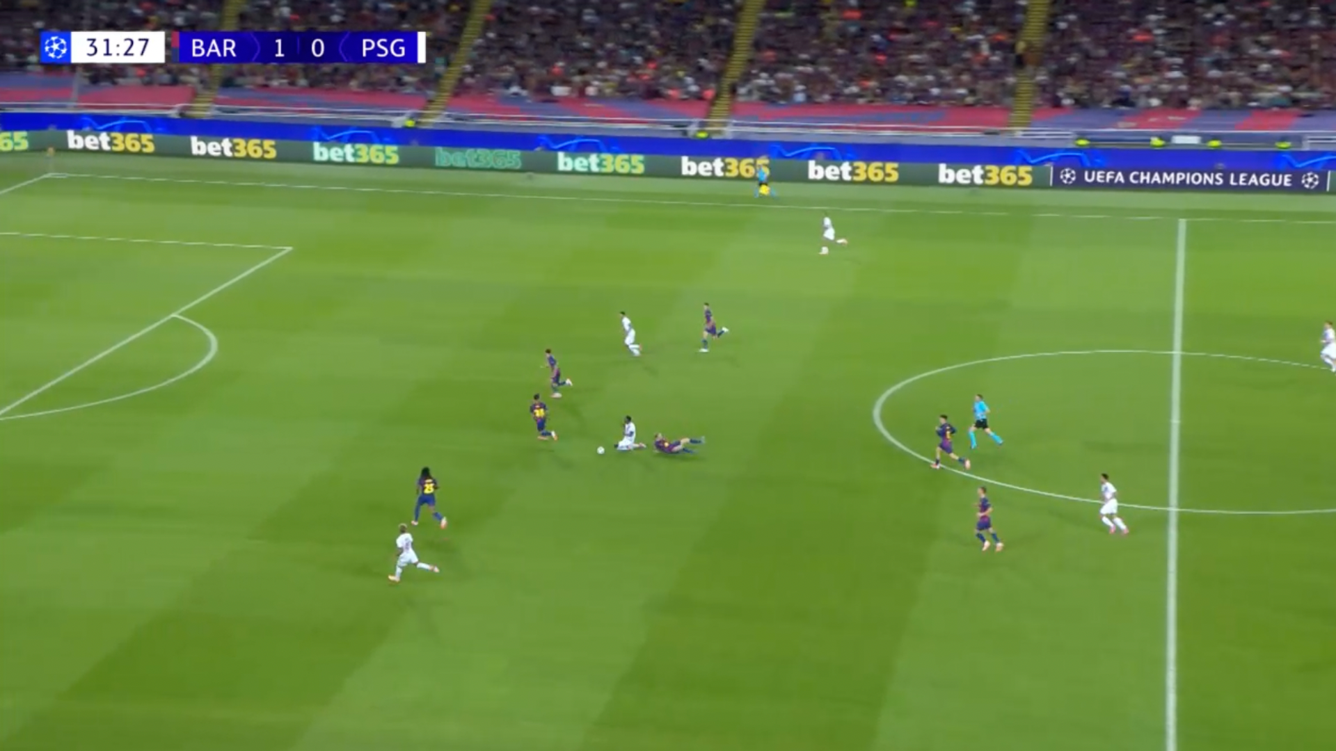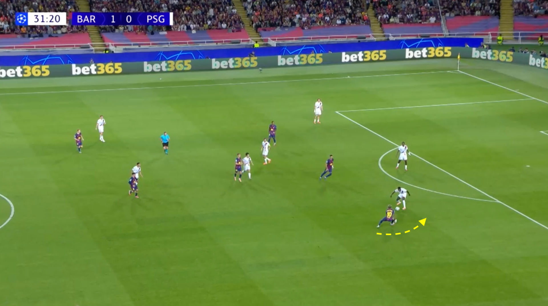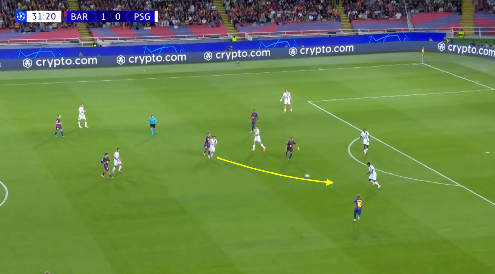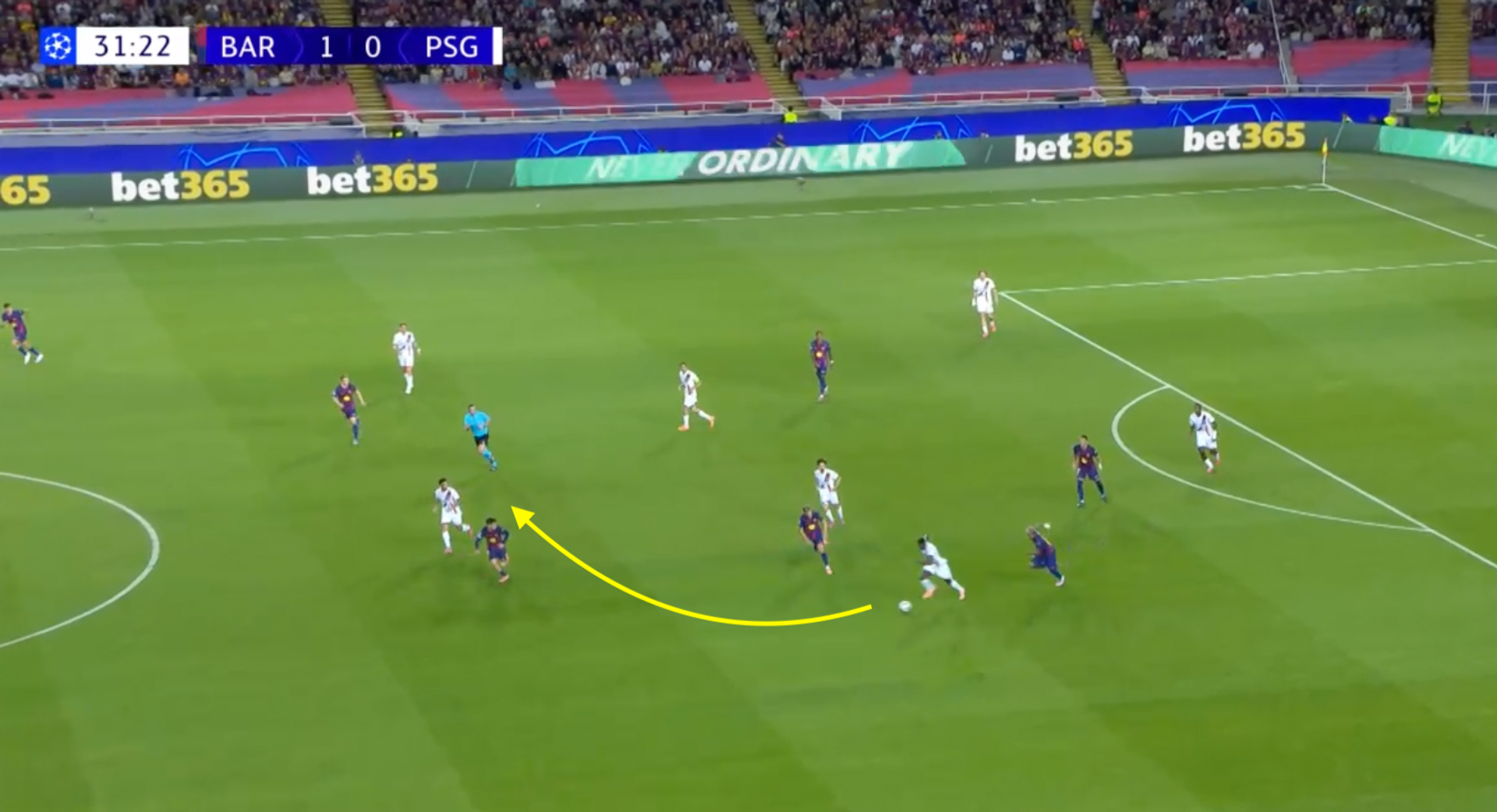 Ma Mendes, che probabilmente sapeva che Lamine Yamal lo avrebbe sbranato da quella parte, controlla il passaggio verso l’interno, e a quel punto se ne è andato. Supera Yamal, poi sterza verso l’interno passando tra Pedri e Olmo, infine accelera davanti a De Jong che lo porta a terra con una scivolata.