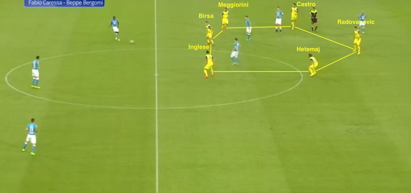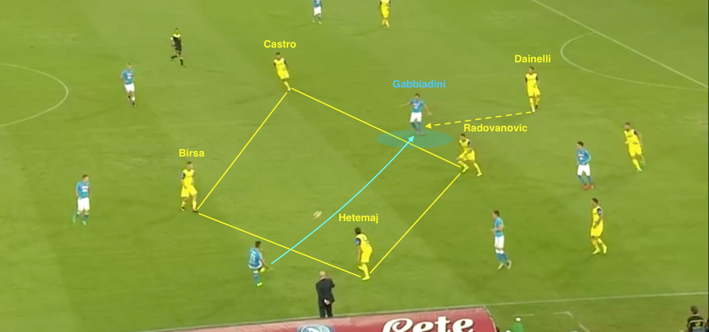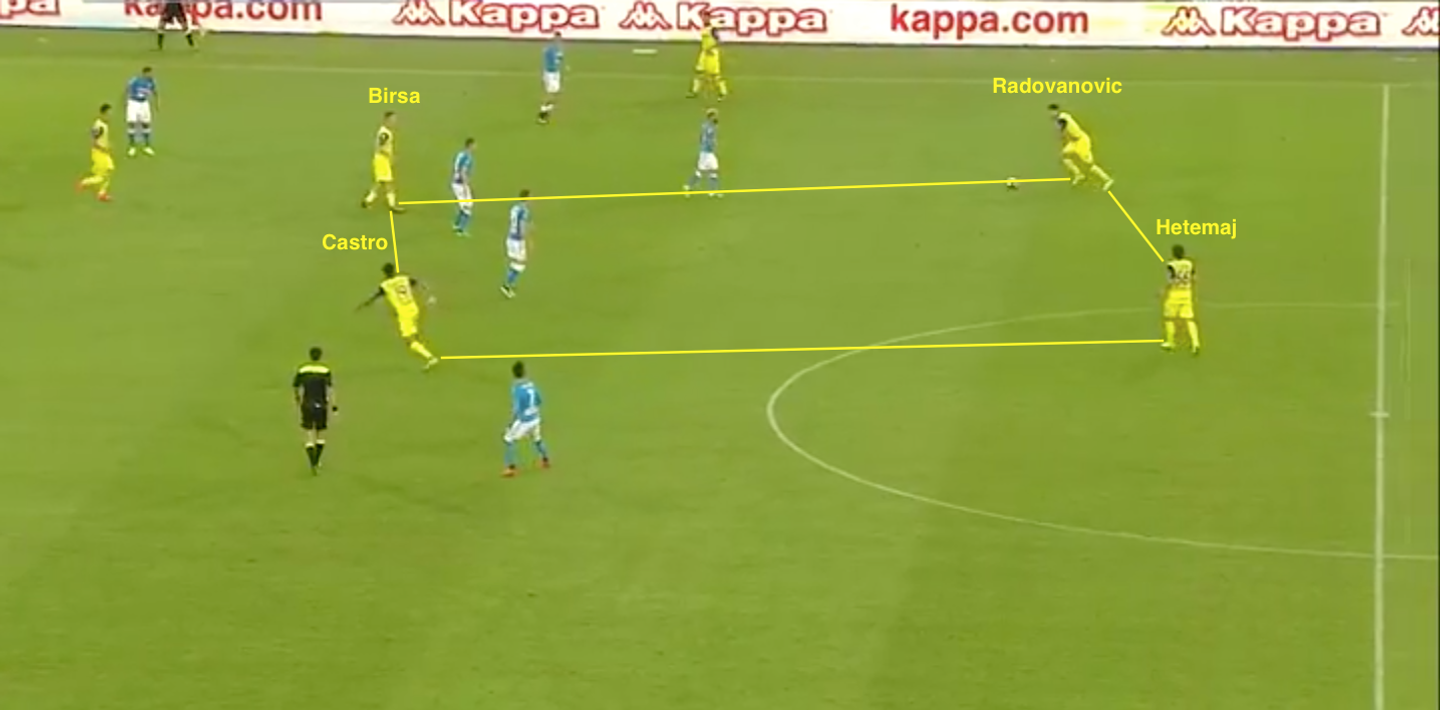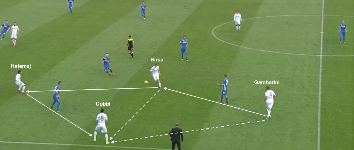 Oppure centralmente, attraverso la trasformazione del rombo di centrocampo in quadrato, con una delle mezzali (di solito Hetemaj) che si abbassa sulla linea del regista a consolidare il possesso e l’altra (di solito Castro) che si alza su quella del trequartista ad attaccare lo spazio tra centrocampo e difesa. Questo comunque non impedisce a Birsa di abbassarsi accanto a Radovanovic, e vedere Hetemaj e Castro sulla trequarti.
