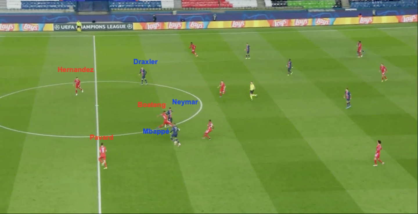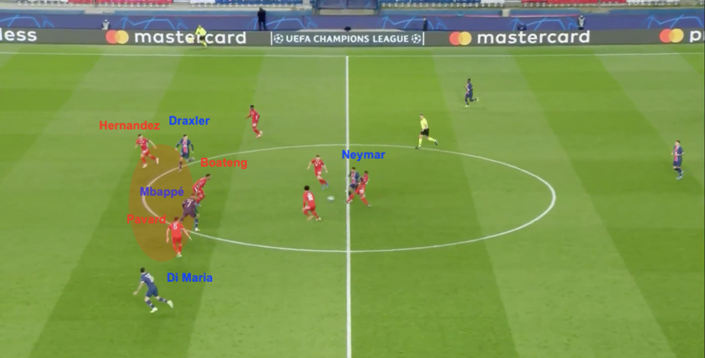 Sarebbe ingiusto però non dare una parte del merito anche ai difensori e al portiere del Bayern. In una squadra che difende sempre e comunque scalando in avanti, e che attacca spesso facendo salire entrambi i terzini, Lucas Hernandez, Boateng e Neuer si sono a volte ritrovati a difendere le transizioni del PSG in tre contro tre o addirittura contro quattro (cioè Neymar, Mbappé, Di Maria e Draxler), come una specie di difesa a tre a porta scoperta. Questa per esempio è l’azione da cui nasce il secondo legno di Neymar, da solo davanti a Neuer, dopo la clamorosa traversa colpita pochi minuti prima.