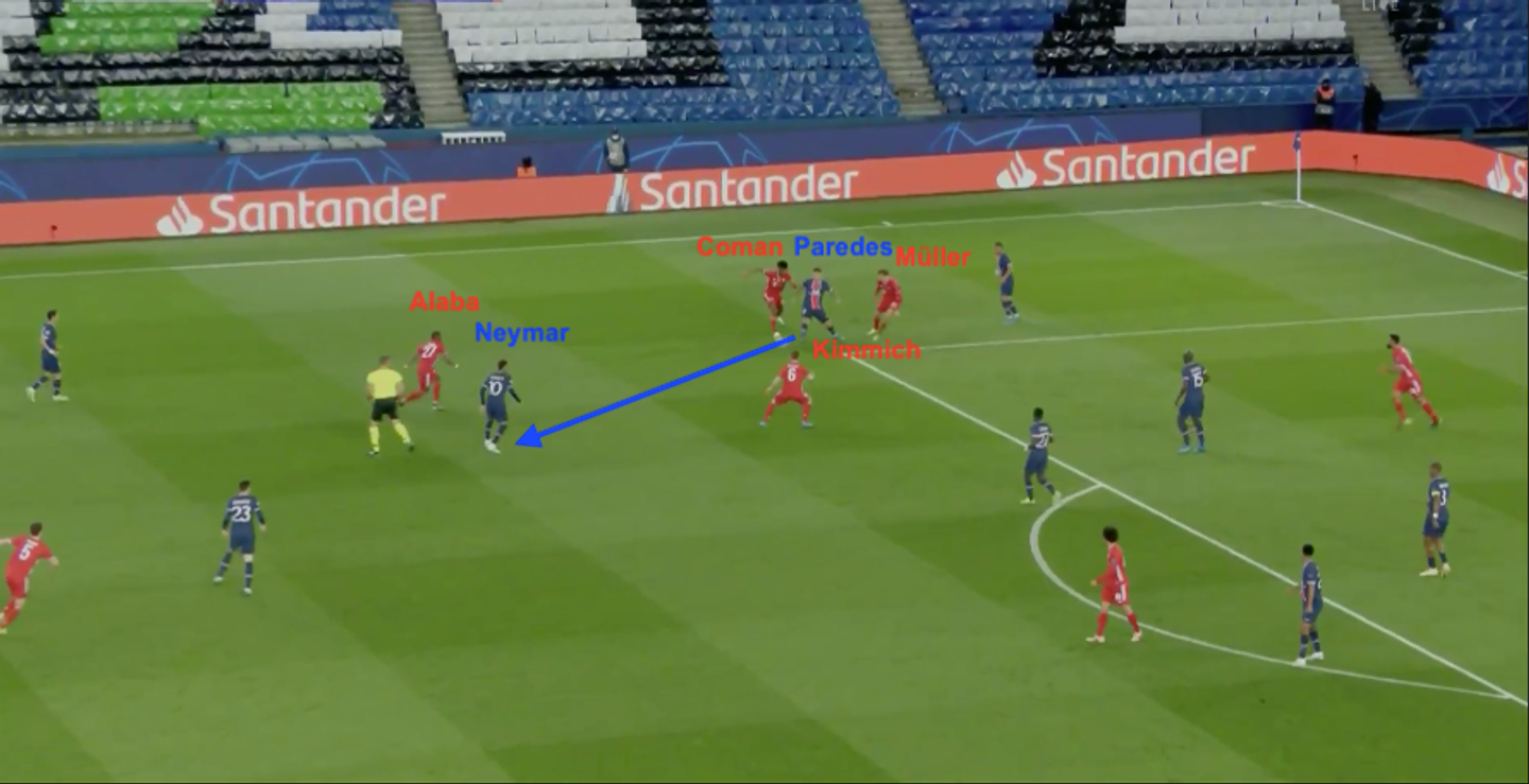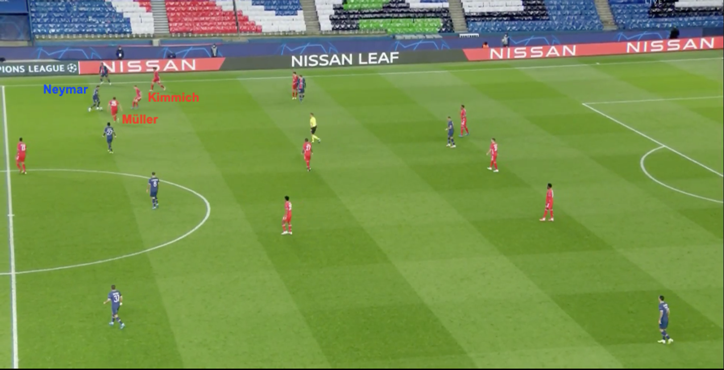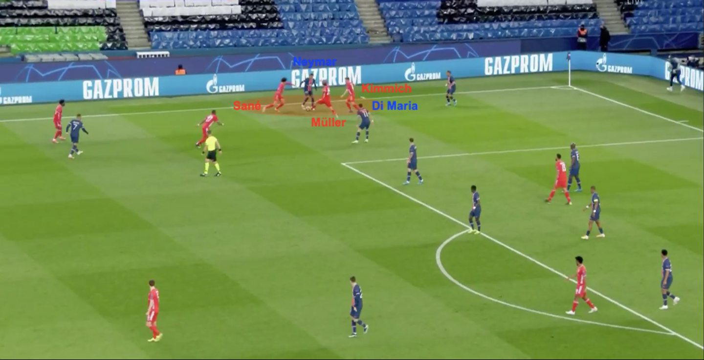Non sempre le finte di Neymar sono dirette a ridicolizzare l’avversario, anzi. L’utilità tattica del suo gioco è ingiustamente sottovalutata, come aveva notato la scorsa stagione Daniele Manusia dopo i quarti di finale di ritorno contro l’Atalanta, tanto più in un calcio dove il tempo e lo spazio sono sempre di meno. Contro una squadra che scala sempre in avanti in maniera verticale ed aggressiva come il Bayern, e che sembra moltiplicare gli uomini con il pressing, i dribbling di Neymar sono stati una risorsa inestimabile per creare superiorità numerica e rendere fragile un sistema altrimenti spietato. Lo si è visto, per esempio, al 22esimo del primo tempo, quando il PSG ha recuperato palla sulla propria mediana dopo un fallo laterale mal gestito dal Bayern. La squadra di Flick ha cercato di recuperare immediatamente palla, che però era tra i piedi di Neymar.