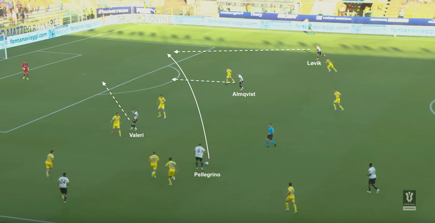 Al momento, per Cuesta c’è solo una certezza: che il centravanti sarà Mateo Pellegrino, e che su di lui verrà appoggiato il peso offensivo della squadra. Per questo, forse, ha optato per avere due esterni a tutta fascia, di cui il mancino Emanuele Valeri messo lì proprio per crossare sulla testa del numero nove argentino. Lo scorso anno, in poche presenze (l’equivalente, in minuti, di neanche nove partite intere) ha segnato tre gol, ma ha mostrato tutta la sua capacità di dominare sui duelli aerei: saggio da parte di Cuesta tenerne conto. Il secondo gol segnato da Pellegrino contro il Pescara è proprio l’esempio perfetto del suo ruolo all’interno della squadra, dalla protezione con apertura per l’esterno in fascia, al movimento per concludere in area.
