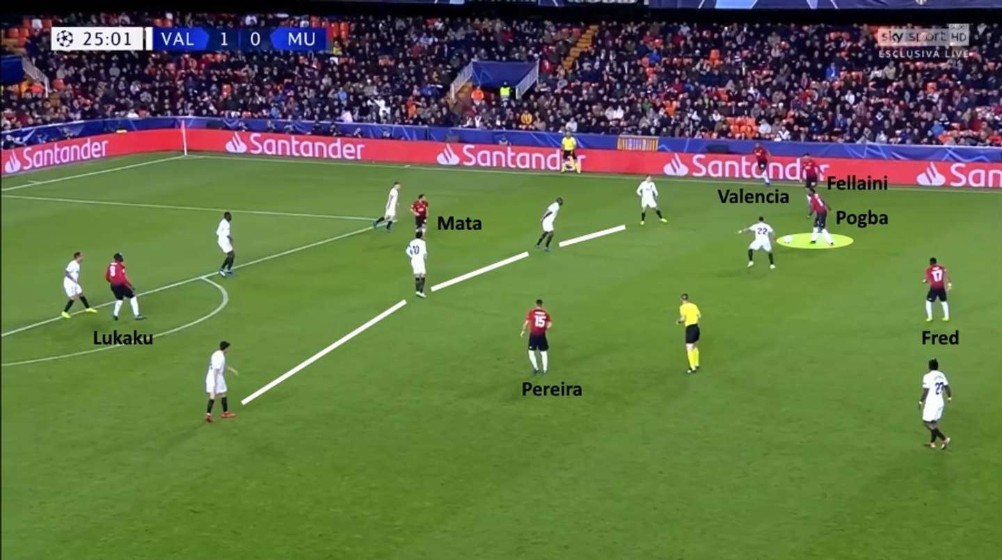 Dall’ultima partita giocata con Mourinho, in Champions League a Valencia. Pogba ha di fronte una linea avversaria ma davanti a lui si muove solo Mata. Alla fine è costretto a scaricare a destra, dove ci sono sia Valencia che Fellaini.