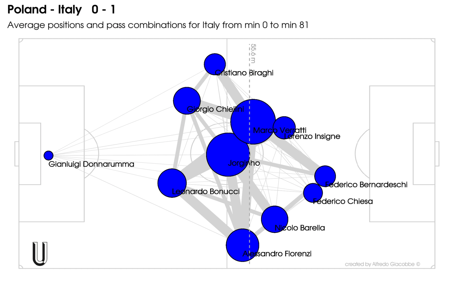 I numeri delle due partite dell’Italia restituiscono una misura della strategia scelta e del suo successo: il possesso palla è stato del 66% contro l’Ucraina e addirittura del 70% nella trasferta polacca, con una percentuale di precisione di passaggi pari rispettivamente al 90% e all’87%; in entrambi i casi il possesso ha generato un vantaggio territoriale di circa il 60% e la squadra ha mantenuto un baricentro alto (59.4 m contro l’Ucraina e 54.3 m contro la Polonia). Il possesso palla è stato efficace nel creare pericoli per la porta avversaria: l’Italia ha tirato 20 volte verso la porta contro l’Ucraina (10 volte da dentro l’area) e 18 contro la Polonia (ben 11 volte da dentro l’area).
