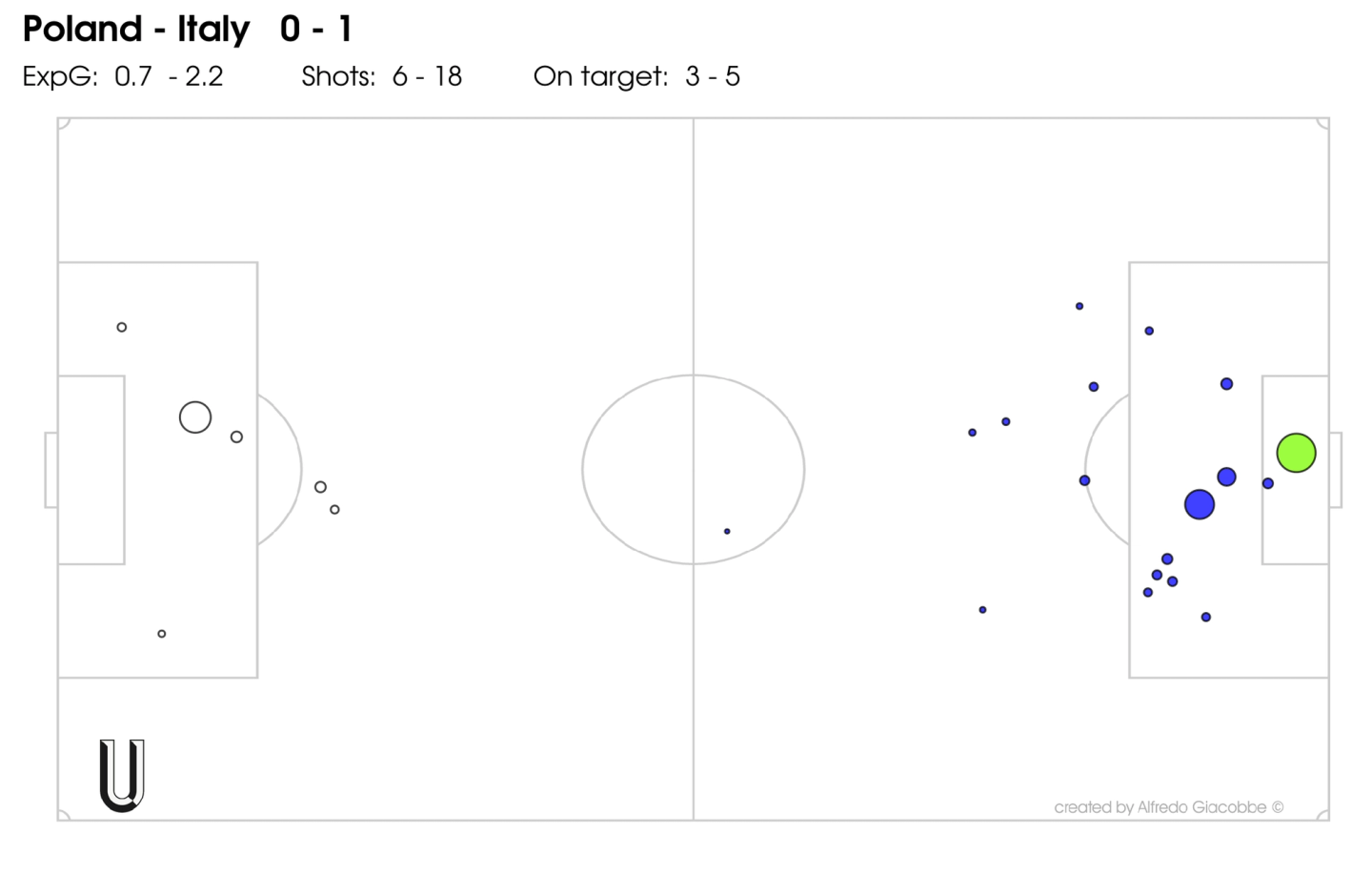 Gli xG prodotti dall’Italia contro la Polonia sono stati ben 2.2, con un rapporto di 0.12 xG/tiro, sintomo di buona qualità delle conclusioni prodotte.